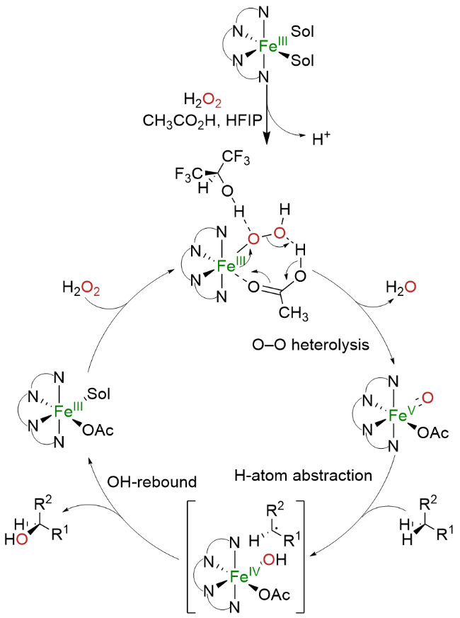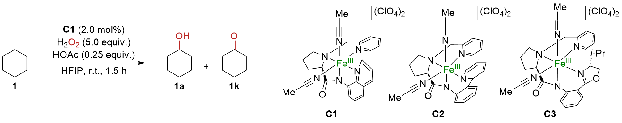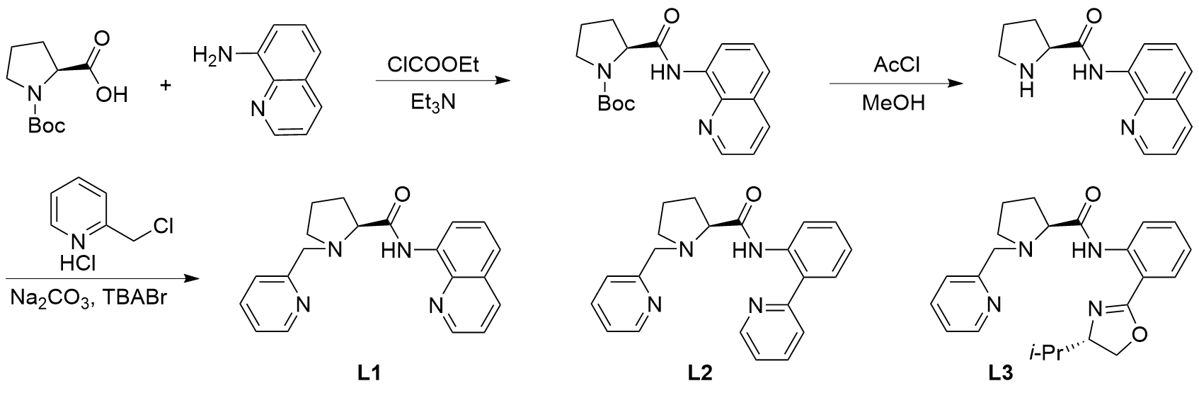(S)-N-(2-(Pyridin-2-yl)phenyl)-1-(pyridin-2-ylmethyl)-pyrrolidine-2-carboxamide (L2): Yellow oil, 60% yield. Rf=0.23 (V(petroleum ether)∶V(ethyl acetate)=10∶1); ${[\alpha ]}_{\text{D}}^{\text{25}}$+121.23 (c 1.0, CHCl3); 1H NMR (400 MHz, CDCl3) δ: 12.33 (s, 1H), 8.54~8.40 (m, 3H), 7.81 (td, J=7.7, 1.8 Hz, 1H), 7.65 (d, J=8.0 Hz, 1H), 7.57 (dd, J=7.8, 1.6 Hz, 1H), 7.51~7.44 (m, 1H), 7.44~7.37 (m, 2H), 7.24~7.14 (m, 2H), 7.13~7.06 (m, 1H), 4.08 (d, J=13.4 Hz, 1H), 3.75 (d, J=13.4 Hz, 1H), 3.44 (dd, J=10.2, 4.4 Hz, 1H), 3.14~2.96 (m, 1H), 2.55 (td, J=9.5, 6.2 Hz, 1H), 2.29~2.15 (m, 1H), 1.93~1.81 (m, 4.0 Hz, 1H), 1.79~1.66 (m, 1H), 1.65~1.52 (m, 1H); 13C NMR (101 MHz, CDCl3) δ: 174.2, 158.7, 158.4, 148.9, 147.8, 137.4, 136.8, 136.5, 129.9, 129.4, 128.1, 123.8, 123.6, 123.4, 122.2, 121.9, 68.3, 61.3, 53.0, 31.1, 24.5. HRMS (ESI) calcd for C22H23N4O [M+H]+ 359.1872, found 359.1873.