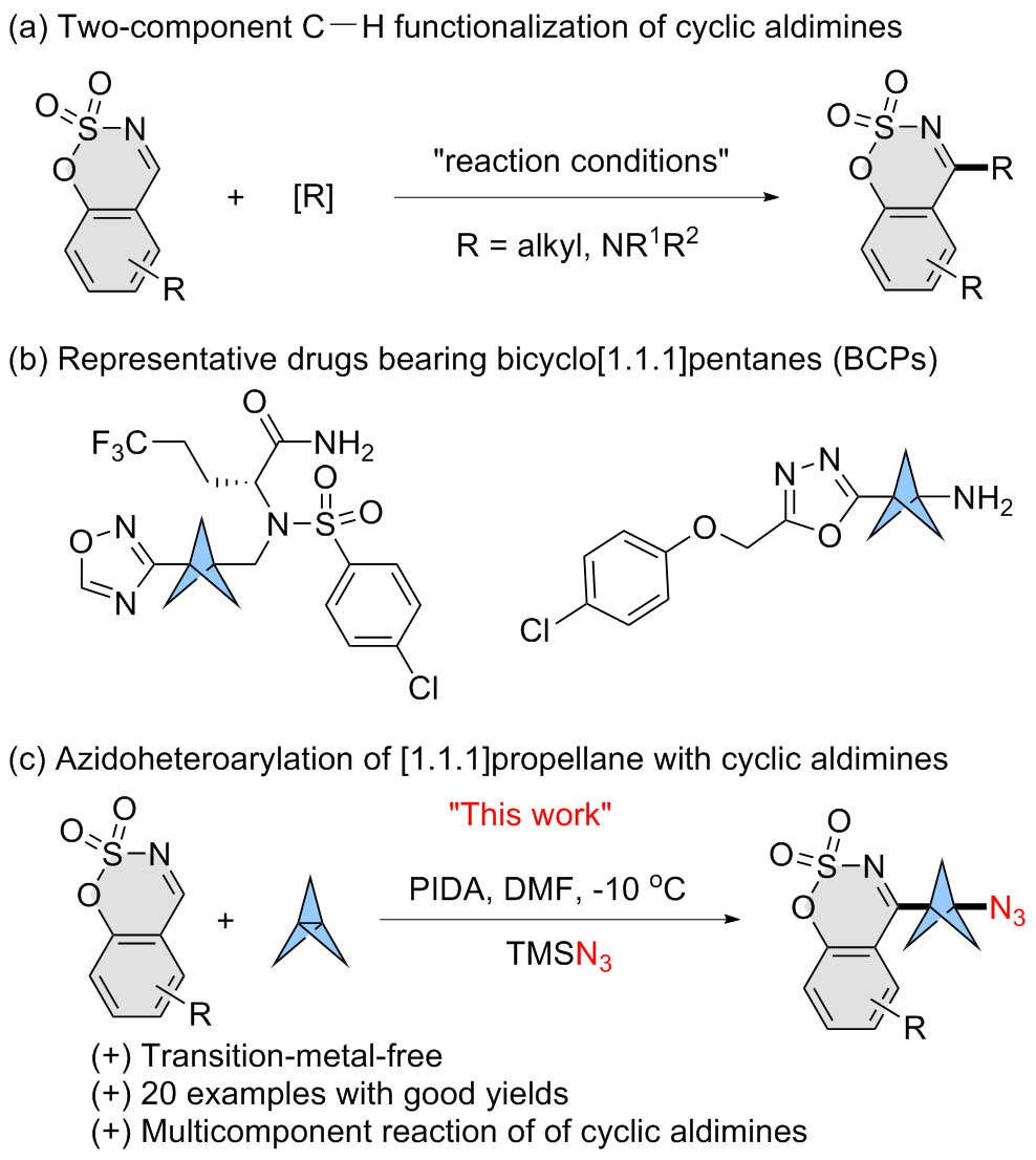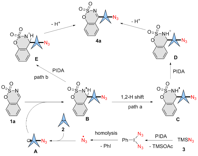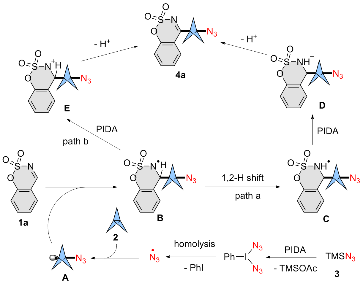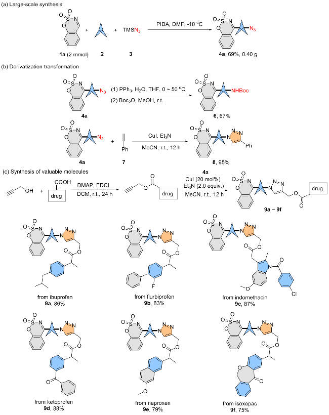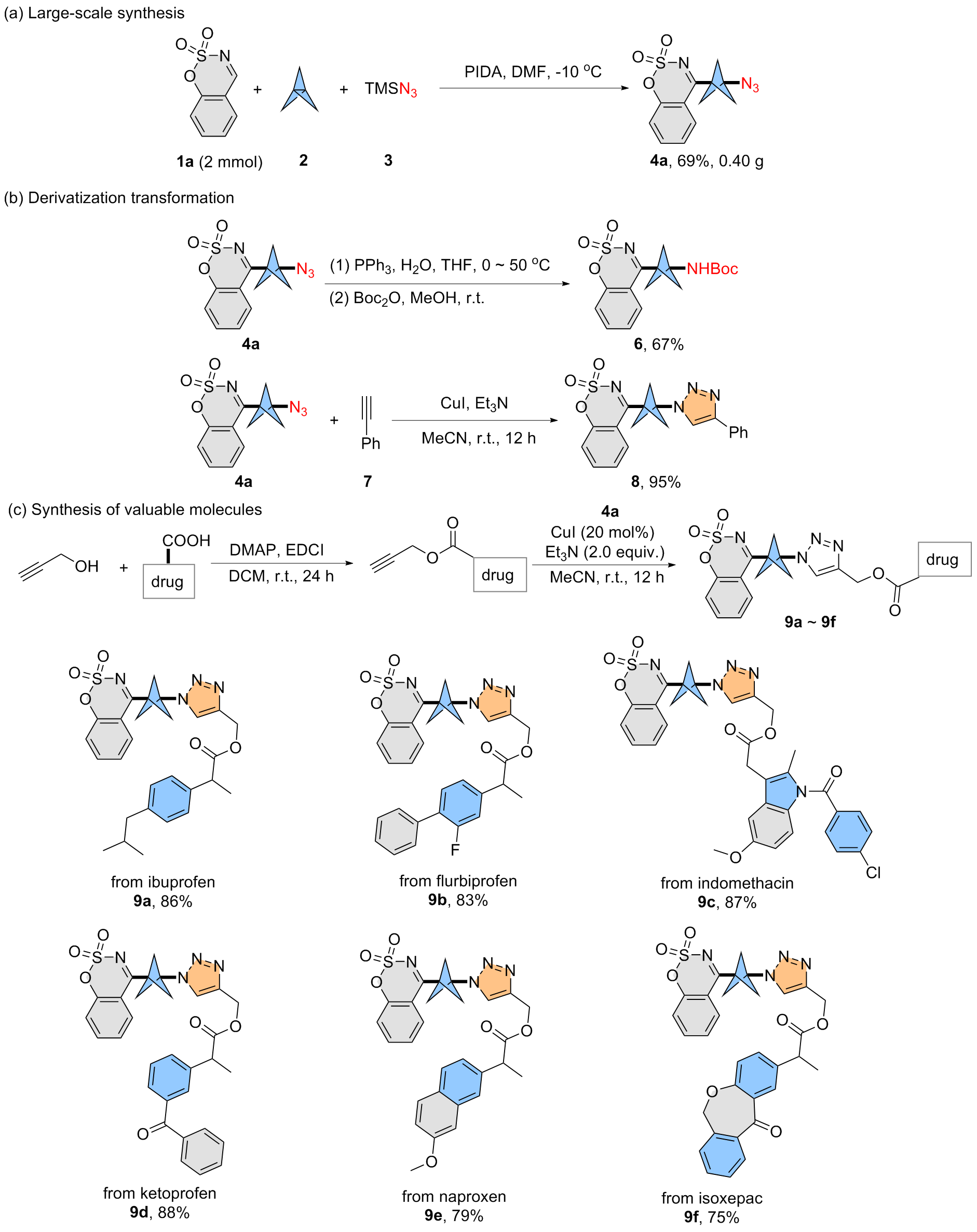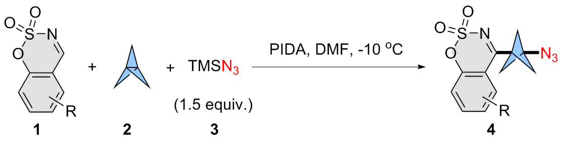 Methyl 4-(3-azidobicyclo[1.1.1]pentan-1-yl)benzo[e]-[1,2,3]oxathiazine-8-carboxylate 2,2-dioxide (4r): Yellow solid (39 mg, 55% yield). m.p. 125~126 ℃; 1H NMR (500 MHz, CDCl3) δ: 8.62 (s, 1H), 8.36 (dd, J=8.6, 2.0 Hz, 1H), 7.38 (d, J=8.7 Hz, 1H), 4.00 (s, 3H), 2.64 (s, 6H); 13C NMR (126 MHz, CDCl3) δ: 174.4, 164.5, 156.5, 137.7, 130.2, 127.9, 119.8, 115.6, 56.3, 53.1, 52.1, 39.1; HRMS (ESI-TOF) calcd for C14H12N4O5SNa [M+Na]+ 371.0421, found 371.0431.