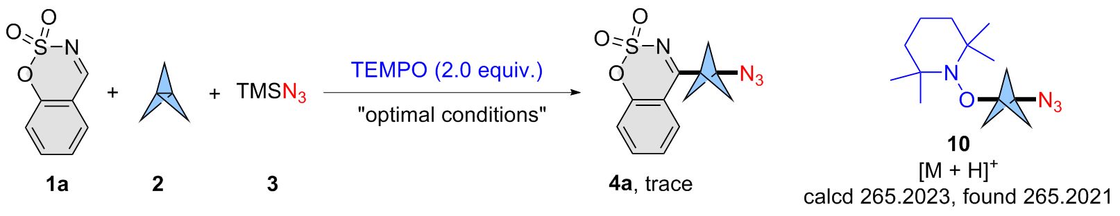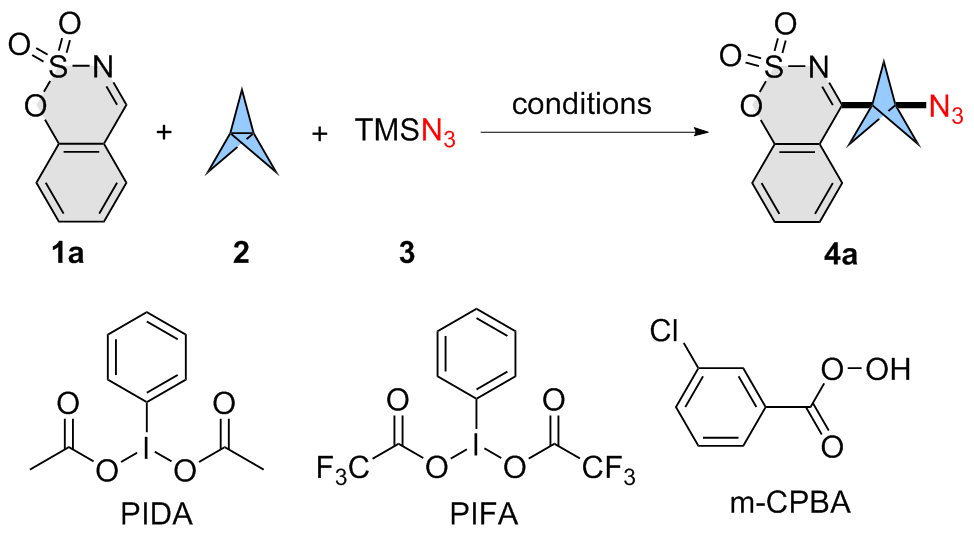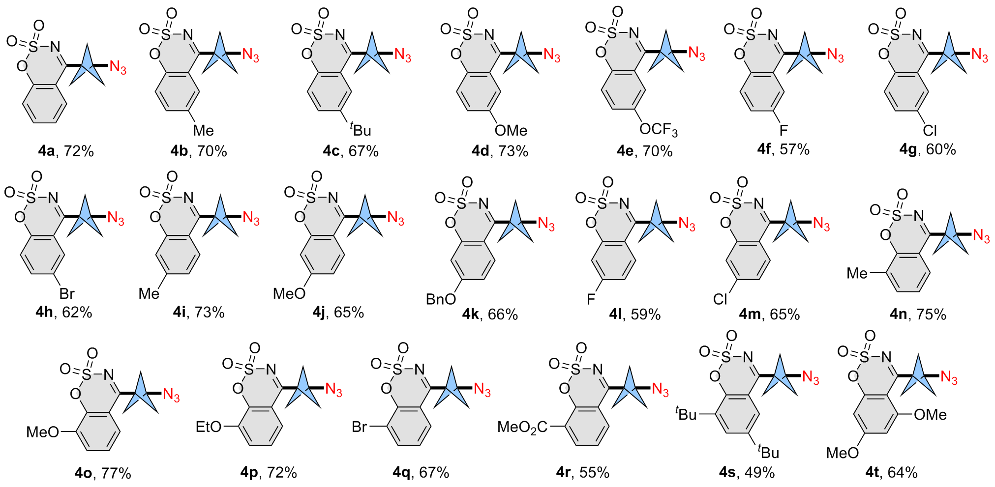 4-(3-Azidobicyclo[1.1.1]pentan-1-yl)benzo[e][1,2,3]-oxathiazine 2,2-dioxide (4a): Yellow solid (42 mg, 72% yield). m.p. 105~106 ℃; 1H NMR (500 MHz, CDCl3) δ: 7.92 (dd, J=8.0, 1.6 Hz, 1H), 7.73 (ddd, J=8.8, 7.5, 1.6 Hz, 1H), 7.39 (td, J=7.7, 1.2 Hz, 1H), 7.33 (dd, J=8.4, 1.1 Hz, 1H), 2.60 (s, 6H); 13C NMR (126 MHz, CDCl3) δ: 174.8, 153.7, 137.1, 128.4, 125.8, 119.5, 116.1, 56.2, 52.1, 39.1; HRMS (ESI-TOF) calcd for C12H10N4O3SNa [M+Na]+ 313.0366, found 313.0367.