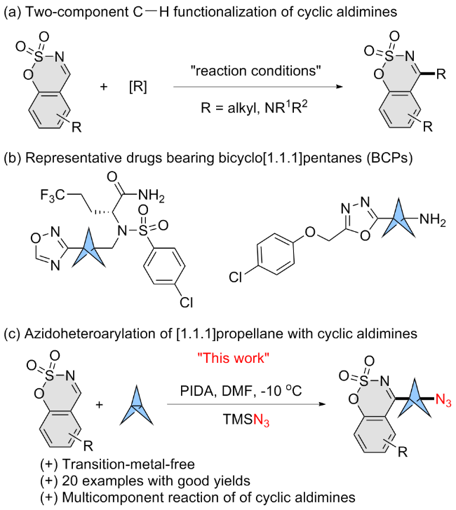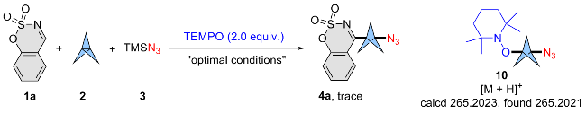 An oven-dried 25 mL Schlenk tube fitted with a magnetic stirring bar was charged with cyclic aldimines 1 (0.2 mmol, 1.0 equiv.), [1.1.1]propellane (2, 0.3 mmol, 1.5 equiv.) and PIDA (0.3 mmol, 1.5 equiv.) under N2 atmosphere. Then, the mixture was cooled down to 10 ℃ and TMSN3 (3) (0.3 mmol, 1.5 equiv.) in DMF (1 mL) was added dropwise under stirring. After stirring at 10 ℃ for 6 h, the mixture was poured into NaHCO3 aqueous solution, and extracted with EtOAc (5 mL×3). The collected organic layer was washed with brine, and dried with MgSO4. The solvent was removed in vacuo, and the obtained residue was further purified by silica gel column chromatography [200~300 mesh silica gel, V(petroleum ether, PE)∶V(ethyl acetate, EA)∶V(DCM)=5∶1∶1] to afford product 4.