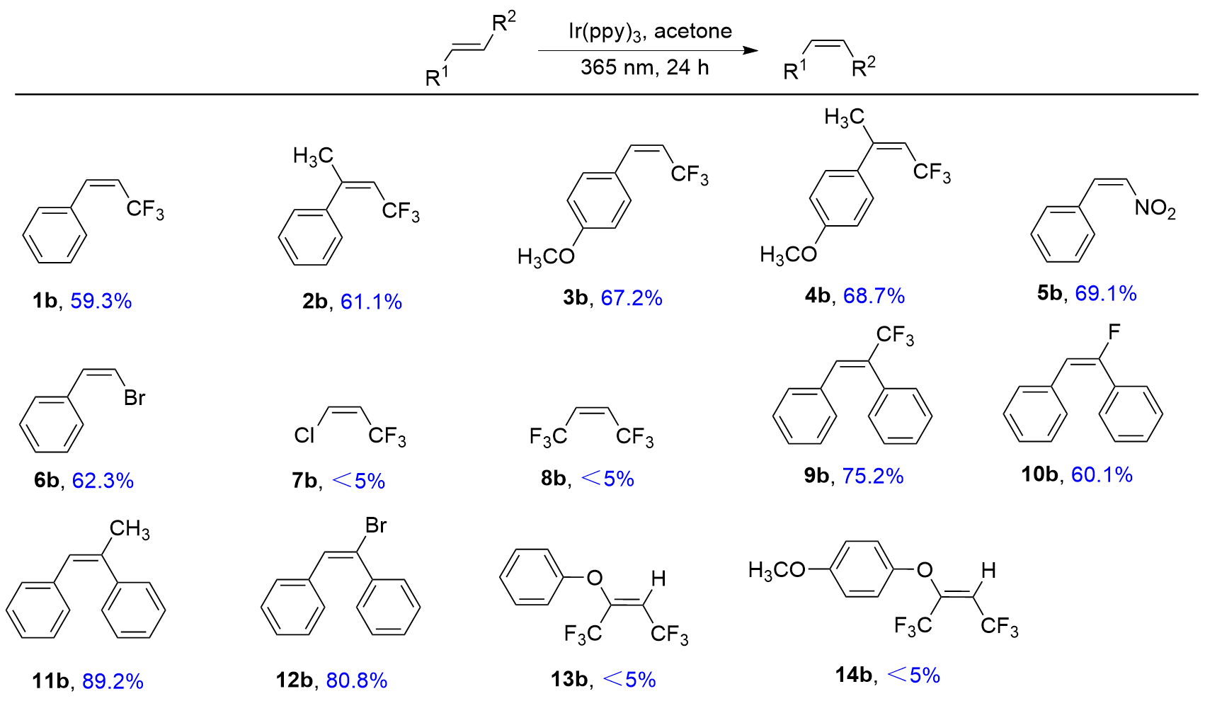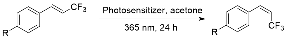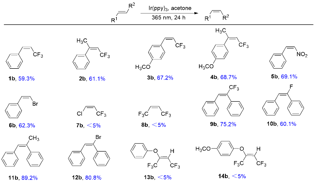 表1 光催化异构化合成顺式-β-三氟甲基苯乙烯及其衍生物a,bTable 1 Photocatalytic isomerization synthesis of cis-β-trifluo- romethylstyrene and its derivatives ![]() |