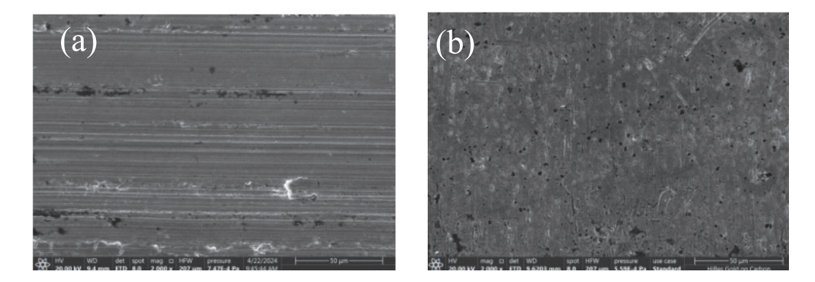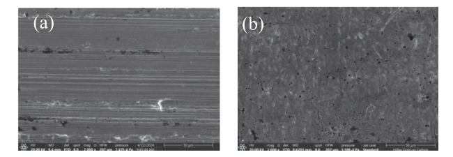 图2 反应前(a)和反应后(b)钢棒表面的SEM谱图Figure 2 SEM spectra of the steel rod surface before (a) and after reaction (b) |