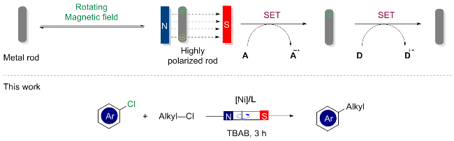 [10], 此项工作利用旋转磁场和金属棒, 通过磁氧化还原/镍催化相结合, 实现了芳基氯和烷基氯的交叉亲电偶联反应(