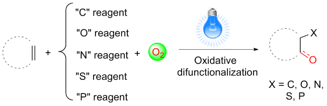Molecular oxygen is regarded as an ideal oxidant due to its abundant content, low cost and non-polluting nature. However, reactions involving dioxygen at room temperature usually suffer from slow rates and low selectivity, and thus require the assistance of enzymes, metal catalysts or other conditions to promote transformation. Visible light-induced organic reactions have attracted extensive attention from chemical researchers due to their simple operation steps, green and sustainable nature as well as mild reaction conditions. In recent years, visible light-induced oxidation difunctionalizations of olefins with molecular oxygen have witnessed swift advancement and became one of the research hotspots in the field of organic synthesis. The recent research progress in the synthesis of oxygen-containing compounds through visible light-catalyzed oxidative difunctionalizations of alkenes with dioxygen is summarized. The selected examples of substrates and the corresponding reaction mechanisms are described, and the development of this field are also prospected.