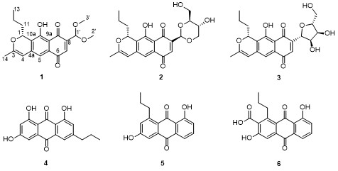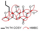 表1 化合物1的1H NMR (600 MHz)和13C NMR (151 MHz)核磁数据(CD3OD)Table 1 1H NMR (600 MHz) and 13C NMR (151 MHz) data of compound 1 in CD3OD |