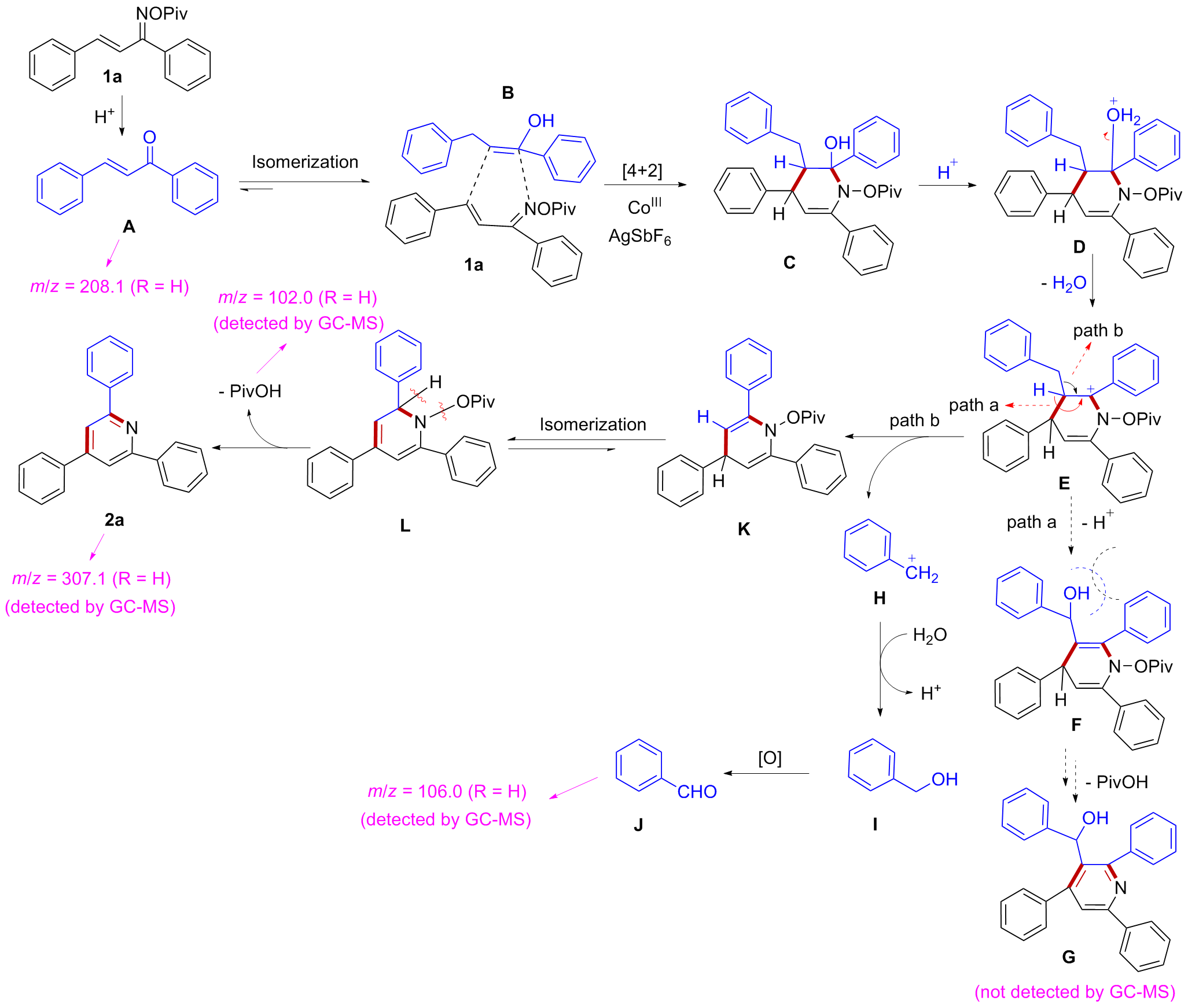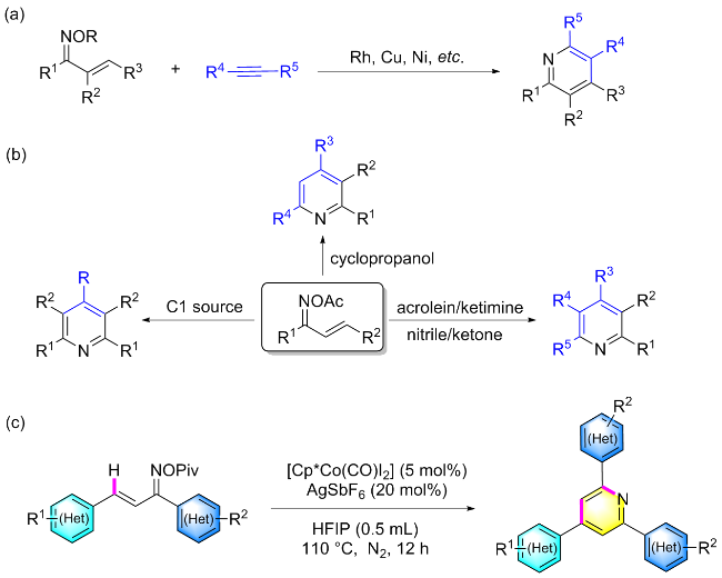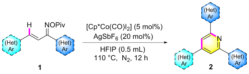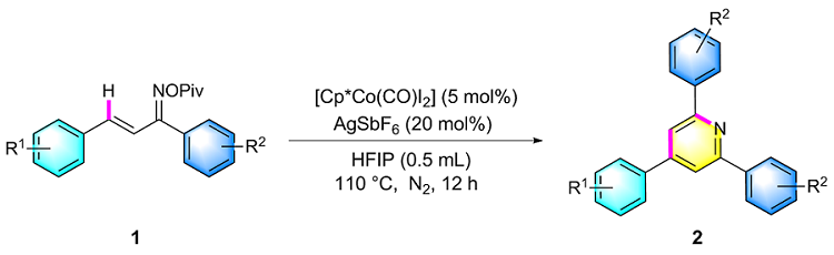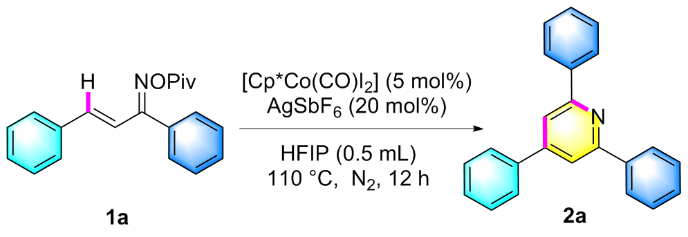 在氮气保护条件下, 向25 mL密封反应管中依次加入磁力搅拌子、α,β-不饱和酮肟酯(1a, 61.5 mg, 0.2 mmol)、催化剂Cp*Co(CO)I₂ (4.8 mg, 0.01 mmol)、六氟锑酸银AgSbF₆ (13.7 mg, 20 mol%)以及溶剂六氟异丙醇HFIP (0.5 mL). 将反应体系置于110 ℃油浴中搅拌反应12 h. 待反应液冷却至室温后, 减压蒸除溶剂, 残留物经硅胶柱层析纯化(洗脱剂: PE/EA, V∶V=7∶1), 最终获得目标产物2a. 化合物2b~2z、2aa和2ab采用同样的方法制备得到.