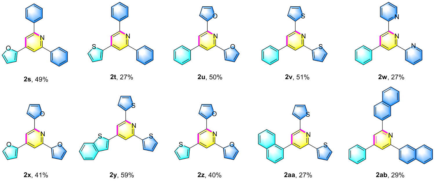 2,6-二萘-2-基-4-苯基吡啶(2ab): 淡黄色油状物, 12.0 mg, 产率29%. 1H NMR (400 MHz, CDCl3) δ: 8.72 (d, J=1.0 Hz, 2H), 8.44 (dd, J=8.6, 1.8 Hz, 2H), 8.09 (s, 2H), 8.03 (dd, J=9.0, 2.6 Hz, 4H), 7.95~7.91 (m, 2H), 7.87~7.83 (m, 2H), 7.61~7.52 (m, 7H); 13C NMR (100 MHz, CDCl3) δ: 157.6, 150.4, 139.2, 137.1, 133.9, 133.6, 129.2, 129.1, 128.8, 128.48, 128.45, 127.8, 127.3, 126.6, 126.3, 125.0, 117.5; HRMS (ESI-TOF) calcd for C31H22N [M+H]+ 408.1747, found 408.1750.