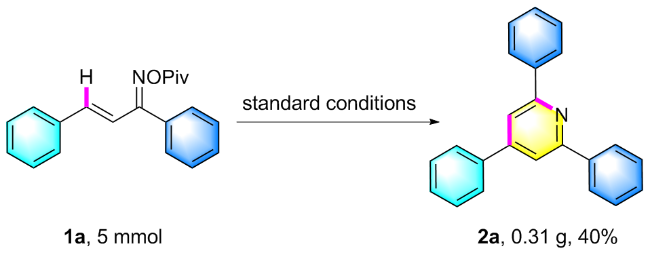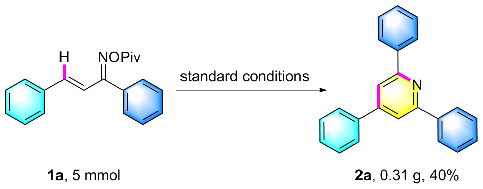 2,4,6-三苯基吡啶(2a): 白色固体, 19.9 mg, 产率65%. m.p. 136.2~137.8 ℃; 1H NMR (400 MHz, CDCl3) δ: 8.23 (d, J=7.4 Hz, 4H), 7.92 (s, 2H), 7.77 (d, J=7.3 Hz, 2H), 7.58~7.45 (m, 9H); 13C NMR (100 MHz, CDCl3) δ: 157.5, 150.2, 139.6, 139.1, 129.2, 129.1, 129.0, 128.7, 127.2, 127.1, 117.2; HRMS (ESI-TOF) calcd for C23H18N [M+H]+ 308.1434, found 308.1434.