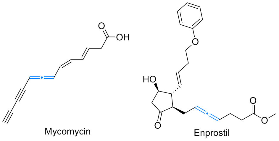 联烯类化合物因含有一组由两个相互垂直的π键组成的累积双键, 所以具有极为丰富的修饰潜力. 这种特殊结构广泛存在于天然产物和药物分子中, 例如菌霉素(Mycomycin)具有抑制结核分枝杆菌活性, 恩前列素(Enprostil)被用作制酸药和抗溃疡药
