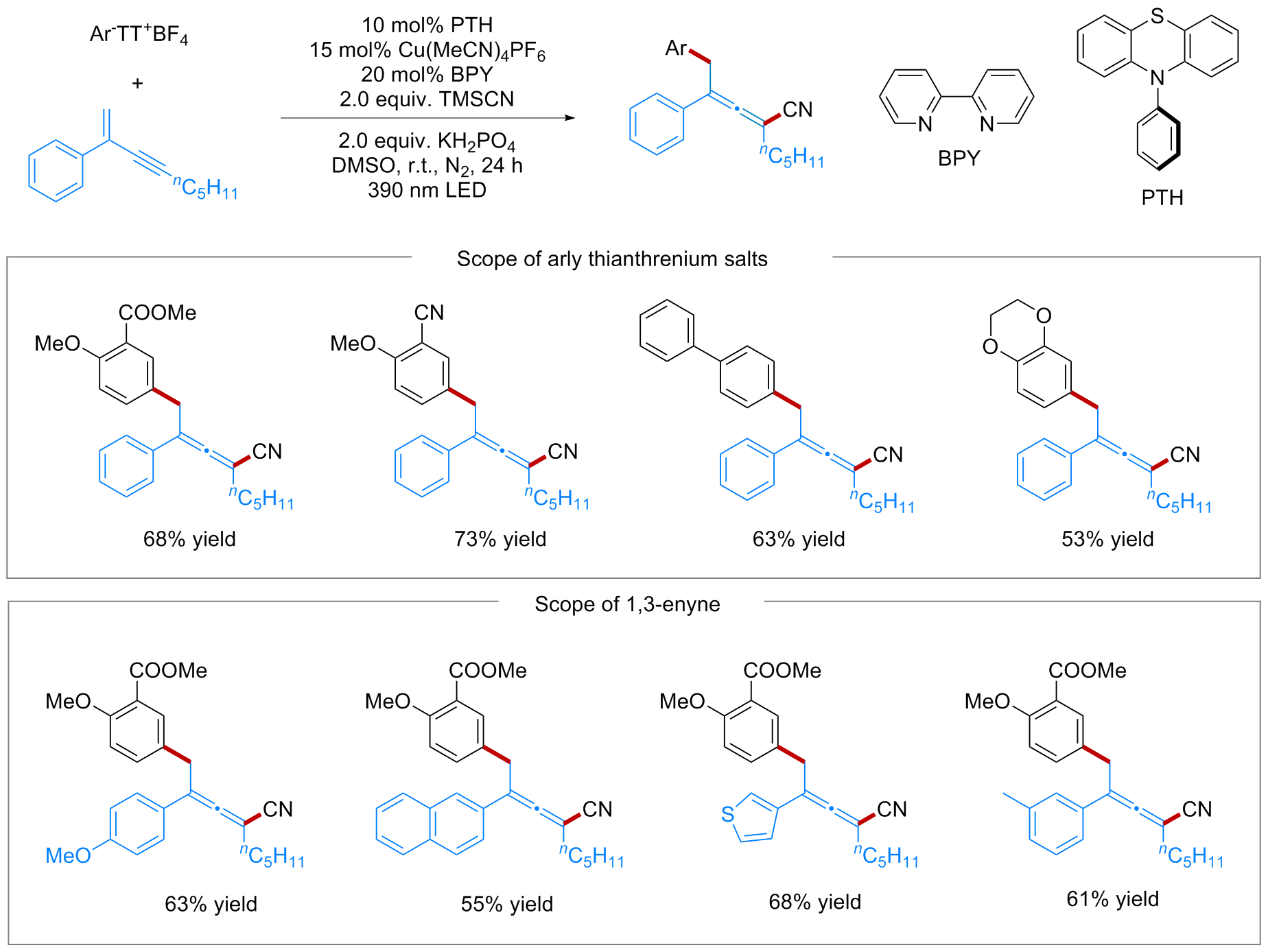 综上, 该研究开发了一例铜/光氧化还原协同催化的1,3-烯炔1,4-芳基氰基化反应, 以噻蒽盐作为芳基自由基前体合成官能化联烯腈类化合物. 该反应条件温和, 具有优异的区域选择性和化学选择性, 表现出广泛的官能团兼容性, 为构建含芳基联烯腈类化合物提供了高效途径. 机理研究表明, 芳基噻蒽鎓盐可作为芳基自由基前体, 为设计自由基介导的多组分反应提供了重要案例.