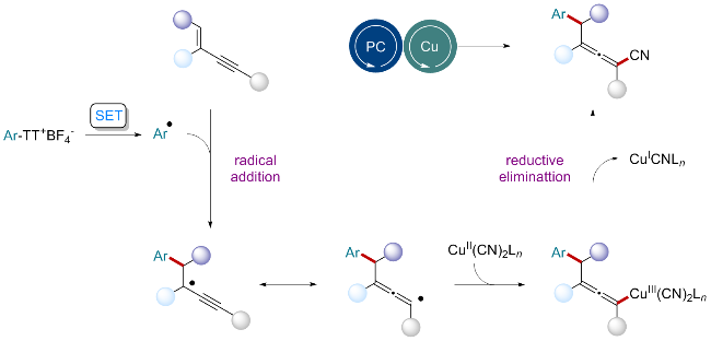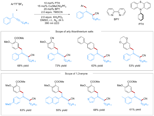 [7]利用芳基噻蒽盐作为芳基化试剂, 通过铜/光氧化还原协同催化体系, 成功实现了1,3-烯炔类化合物的1,4-芳基氰化反应, 高效合成了四取代联烯腈类化合物(