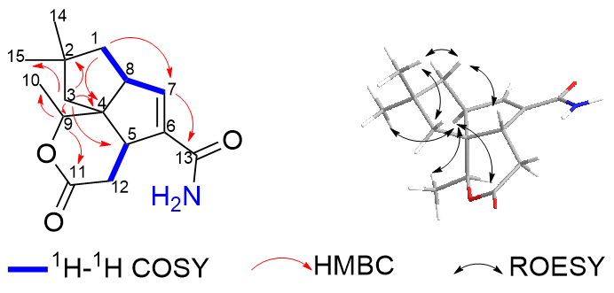 δ -5.71). The heteronuclear multiple bond correlations (HMBC) observed between H-9 to C-10 and C-11, and H-1 to C-7, and H-7 to C-13 provided further confirmation that