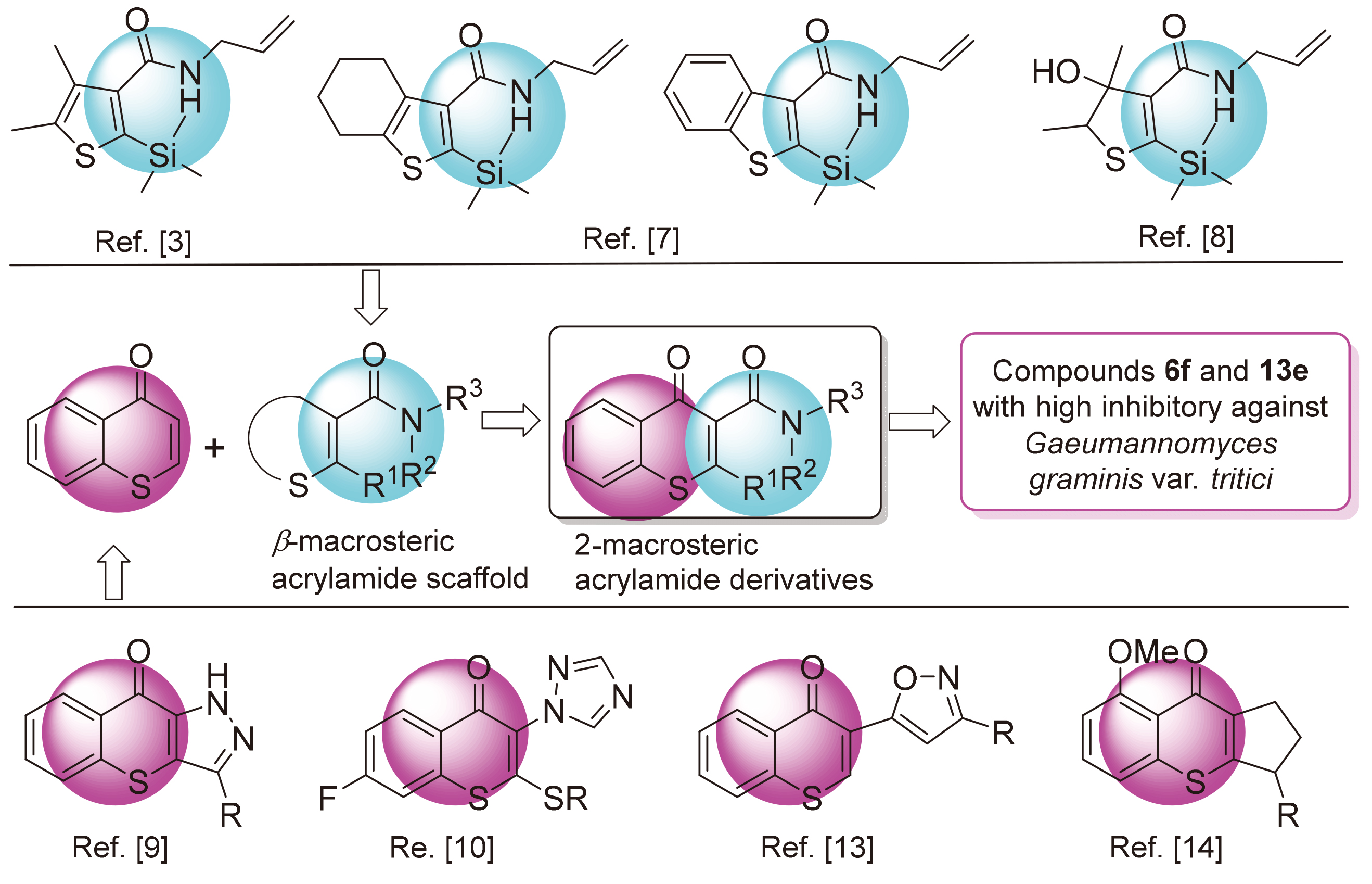 About the Cover:13 new thiochromone formamide derivatives substituted at position 2 were synthesized and two synthetic routes for these compounds were developed by Zhou, Su, Cui, Cheng, Li, Zhou, Sun, and Li on page 87. Their antifungal activities against Gaeumannomyces graminis/ var. tritici were evaluated in vitro by the plate method. The results of structure-activity relationship indicated that the group at position 2 of thiochromone formamide derivatives had an important influence on their antifungal activities against Gaeumannomyces graminis var. tritici. -