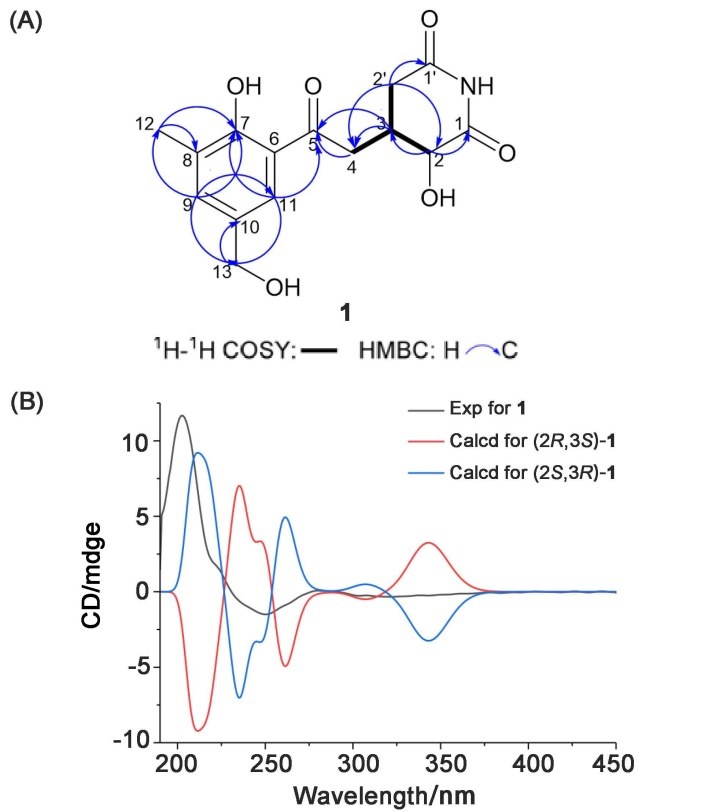 Two new glutarimide derivatives, 2-hydroxy-3-[2-(2-hydroxy-3-methylphenyl-5-hydroxymethyl)-2-oxoethyl] glu- tarimide (1) and 2-hydroxy-3-[2-[2-hydroxy-3-hydroxymethyl-5-methylphenyl]-2-oxoethyl] glutarimide (2), along with 8 known compounds were isolated from the liquid fermentation broth of endophytic Streptomyces sp. YINM00048 obtained from Agrimonia pilosa. Their structures were elucidated through comprehensive spectroscopic analysis, including nuclear magnetic resonance, high-resolution mass spectrometry, and single-crystal X-ray diffraction, supported by time-dependent density functional theory (TDDFT)-electronic circular dichroism (ECD) calculations. Furthermore, compound 2 displayed weak cytotoxic activity against A549 and SMMC-7721 cell lines with IC50 values of 62.69 and 55.07 μmol/L, respectively.