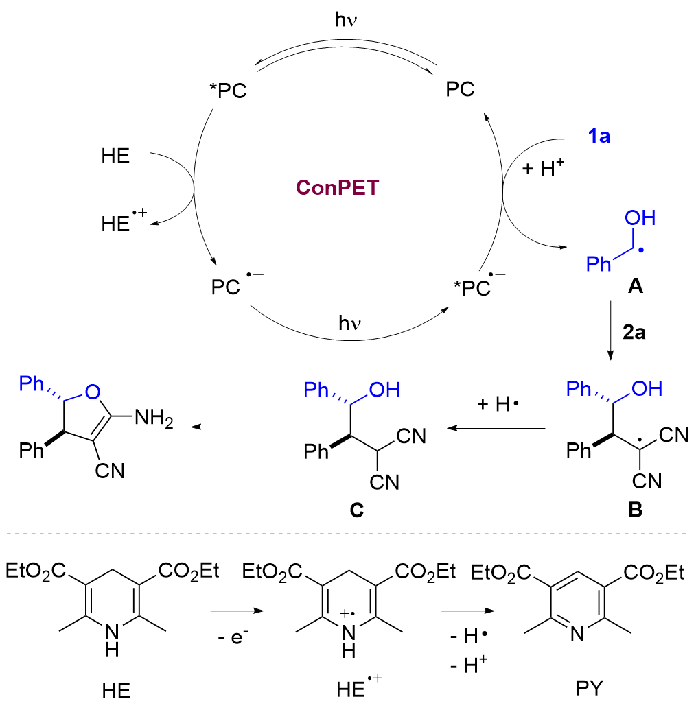 以3a的合成为例, 反应在烘箱干燥的20 mL圆底反应管中进行. 称取0.2 mmol苯甲醛、0.3 mmol苄烯丙二腈、0.001 mmol 4CzIPN、0.5 mmol HE和60 mol%的硫酸钠, 加入反应管中, 并用2.0 mL甲苯溶解, 密封并通过充放气3次充入氩气, 用35 W蓝光LED灯照射, 搅拌18 h. 反应过程通过TLC监测. 反应结束后混合物经乙酸乙酯萃取、无水硫酸钠干燥、过滤及减压旋蒸得到粗产品, 再使用硅胶(200~300 目)进行柱层析或硅胶(GF254)进行薄层层析(石油醚/二氯甲烷, V∶V=4∶1~1∶1)得到产物3a. 其他部分不够纯的产物通过重结晶进一步纯化.