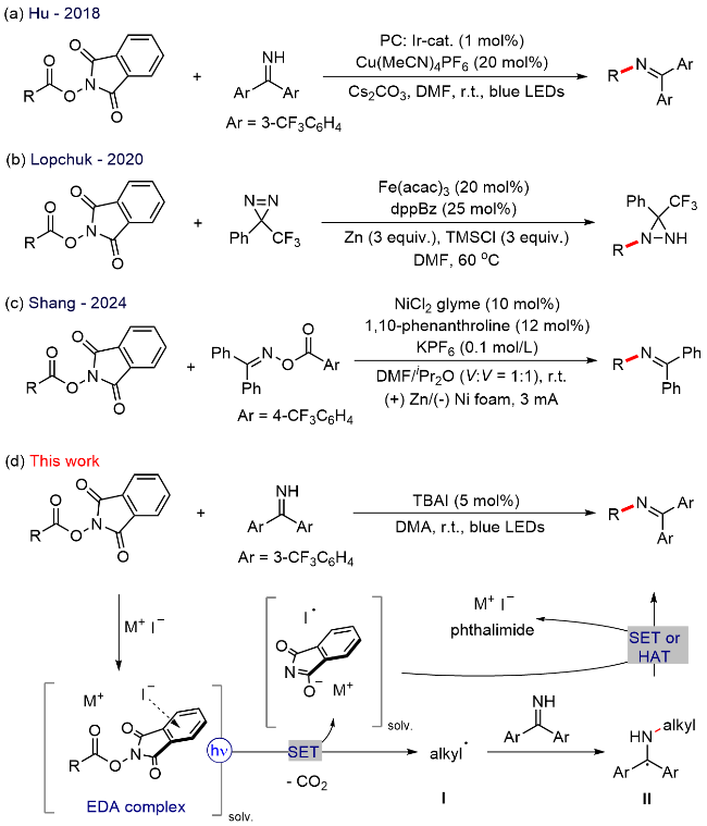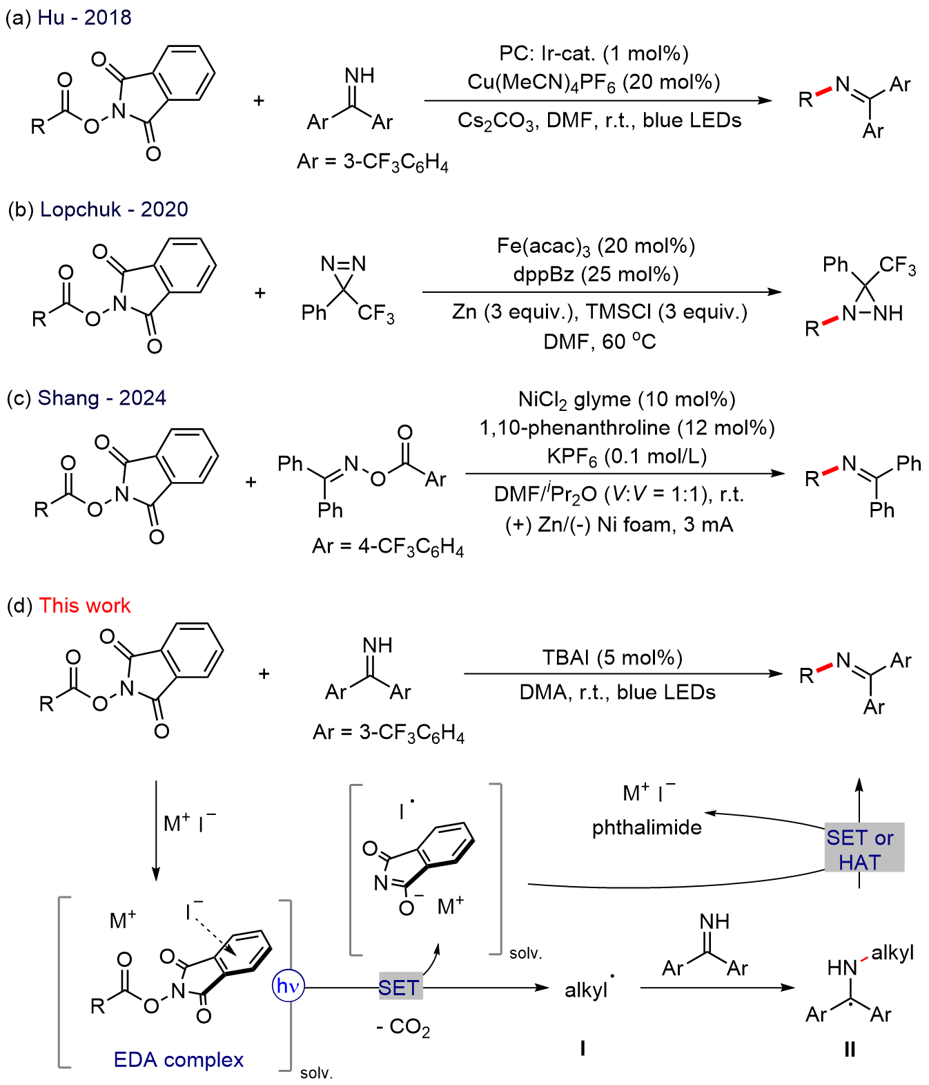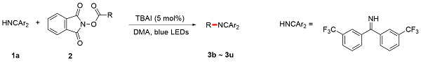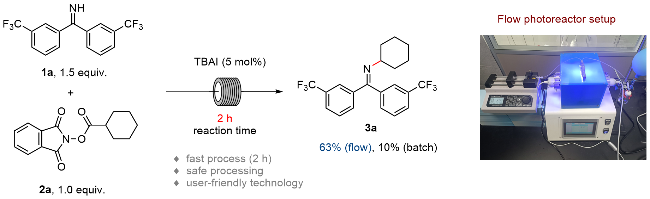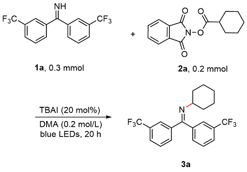 A 100 mL round bottom flask equipped with a magnetic stir bar was charged with 1,3-dioxoisoindolin-2-yl cyclohexanecarboxylate (5.0 mmol, 1.0 equiv.), bis(3-(trifluoro-methyl)phenyl)methanimine (7.5 mmol, 1.5 equiv.) and TBAI (0.25 mmol, 5 mol%). The reagents were dissolved in anhydrous DMA and the total volume of the solution was adjusted to 25 mL. The resulting mixture bubbled with an argon balloon for 20 min. After that, the reaction solution was introduced to the flow apparatus. The flow apparatus was purged with degassed argon to remove the air first. The syringe pump was then connected to the reaction mixture and 3.6 mL of polyfluoroalkoxy (PFA) microreactor coil (internal diameter of 1.0 mm) with a 34.5 kPa back-pressure regulator (BPR). The reaction was placed under 450 nm blue LEDs. The flow apparatus itself was set up with residence time (tR)=2 h, flow rate=1.8 mL/h. When the syringe was fully empty, a crude sample (1 mL) was taken from the collected solution and analyzed by determined through GC analysis. The yield of product 3 was determined to be 63%.
