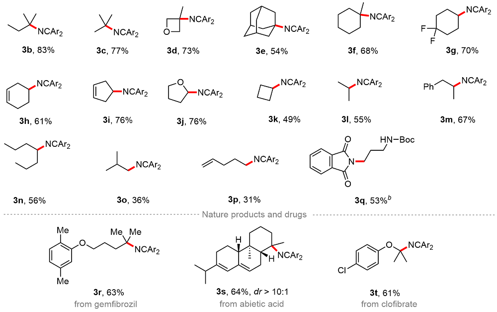 N-((1R,4aR,4bR,10aR)-7-Isopropyl-1,4a-dimethyl-1,2,3,4,4a,4b,5,6,10,10a-decahydrophenanthren-1-yl)-1,1-bis-(3-(trifluoromethyl)phenyl)methanimine (3s): 73.4 mg, 64% yield, colorless oil. 1H NMR (600 MHz, Chloroform-d) δ: 7.78 (s, 1H), 7.69 (d, J=7.9 Hz, 1H), 7.57 (q, J=7.8 Hz, 3H), 7.44 (s, 1H), 7.41~7.36 (m, 2H), 5.84 (s, 1H), 5.53 (s, 1H), 2.51 (d, J=18.8 Hz, 1H), 2.28~2.20 (m, 1H), 2.10 (d, J=10.8 Hz, 2H), 2.06 (s, 1H), 1.99 (d,J=13.0 Hz, 1H), 1.80 (d, J=12.0 Hz, 2H), 1.52~1.37 (m, 4H), 1.30~1.20 (m, 2H), 1.14~1.07 (m, 1H), 1.03 (t, J=6.5 Hz, 6H), 0.97 (s, 3H), 0.82 (s, 3H); 13C NMR (151 MHz, Chloroform-d) δ: 159.0, 145.2, 142.3, 140.3, 135.4, 131.7, 131.2, 130.6 (q, J=32.4 Hz), 130.5 (q, J=32.5 Hz), 128.6, 128.4, 126.1 (q, J=3.8 Hz), 125.1 (q, J=4.0 Hz), 125.0 (q, J=4.7 Hz), 124.3 (q, J=4.0 Hz), 124.0 (q, J=272.4 Hz), 123.8 (q, J=272.7 Hz), 122.5, 121.8, 62.4, 52.9, 51.3, 40.4, 38.1, 35.5, 34.9, 27.6, 24.7, 22.7, 22.0, 21.4, 20.9, 19.4, 13.8; 19F NMR (564 MHz, Chloroform-d) δ: -62.6, -62.7. HRMS (ESI) calcd for C34H38F6N [M+H]+574.2903, found 574.2896.