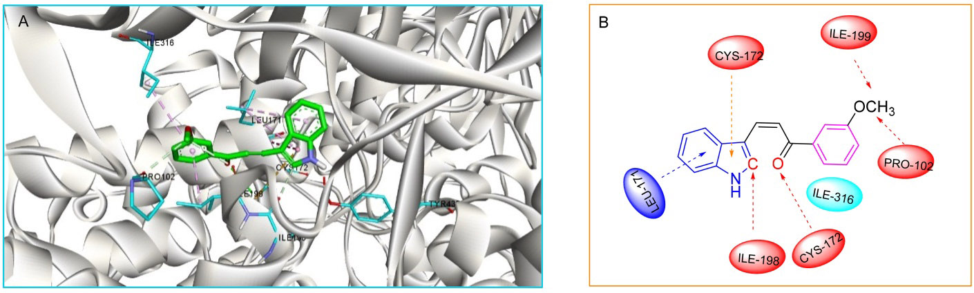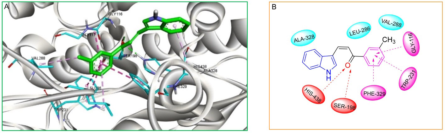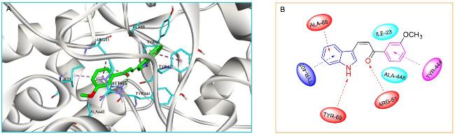 (E)-1-(4-羟基苯基)-3-(1H-吲哚-3-基)丙-2-烯-1-酮 (1v): HPLC/Purity: 90.54% (tR=5.619 min), yield 44.70%. m.p. 190.4~194.6 ℃; 1H NMR (300 MHz, DMSO-d6) δ: 11.88 (s, 1H, NH), 9.96 (s, 1H, OH), 8.29 (s, 1H, NCH=C for indol ring), 8.08 (d, J=15.0 Hz, 1H, COCH=CH), 7.79~8.13 (m, 4H, C6H4), 7.55 (d, J=15.0 Hz, 1H, COCH=CH), 6.92~7.70 (m, 4H, C6H4); 13C NMR (75 MHz, DMSO-d6) δ: 187.53, 185.47, 162.30, 138.11, 137.94, 132.96, 131.13, 130.19, 125.65, 123.94, 123.06, 122.61, 121.48, 120.79, 115.96, 115.82, 113.27, 112.86; HRMS calcd for C17H14NO2 [M+H]+ 264.1025, found 264.1030.