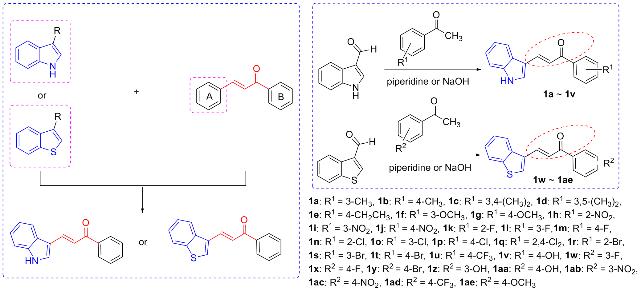 将不同取代基的苯乙酮(3 mmol, 0.12 g)和氢氧化钠(3 mmol)溶解于15 mL无水乙醇中, 并在室温下搅拌1 h. 称取苯并噻吩-3-甲醛(3 mmol, 0.486 g)添加到圆底烧瓶中, 待全部溶解并使反应稳定后, 将烧瓶移至65 ℃的油浴中, 加热回流过夜反应. 使用薄层色谱法监测反应进程. 当TLC完全跟踪反应后, 将圆底烧瓶从油浴中取出. 待其冷却至室温后, 将溶液倒入冰水中进行淬火, 析出黄色固体. 过滤使固液分离, 用冷无水乙醇洗涤漏斗中的滤饼2~3次, 洗涤后的滤饼用三氯甲烷或甲醇进行重结晶, 以获得干净的黄色固体.