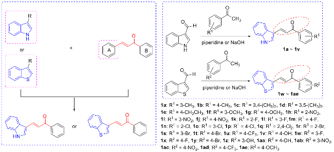 取哌啶1.3 g (1.5 mmol)和不同取代基的苯乙酮(3 mmol)于装有15 mL无水乙醇的圆底烧瓶中. 常温条件下搅拌4 h后, 加入0.435 g吲哚-3-甲醛(3 mmol), 待其全部溶解并反应稳定后, 加热回流过夜. 使用薄层色谱(TLC)监测反应进展, 待反应完成后, 冷却至室温, 将溶液倒入冰水中进行淬灭, 析出黄色固体. 过滤使固液分离, 用冷无水乙醇或正己烷洗涤漏斗中的滤饼2~3次, 洗涤后的滤饼用无水乙醇或甲醇进行重结晶以获得黄色固体产物.