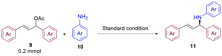 在手套箱中, 向另一个8 mL反应瓶中入[Pd(C3H5)-Cl]2-(Sa,Sp)-L1的储备液(8.0 mmol/L, 0.50 mL, 0.020 equiv.). 随后依次加入9 (0.20 mmol, 1.0 equiv., 溶于0.50 mL乙二醇二甲醚中)、10 (0.40 mmol, 2.0 equiv.)和KOAc (39 mg, 0.40 mmol, 2.0 equiv.). 将反应瓶盖紧密封, 从手套箱中取出, 在25 ℃下搅拌16 h. 随后浓缩反应混合物并通过硅胶柱色谱法(PE/EA(乙酸乙酯)/2% Et3N)纯化, 得到产物11(所有外消旋产物均使用rac-L1按照相同条件制备).
