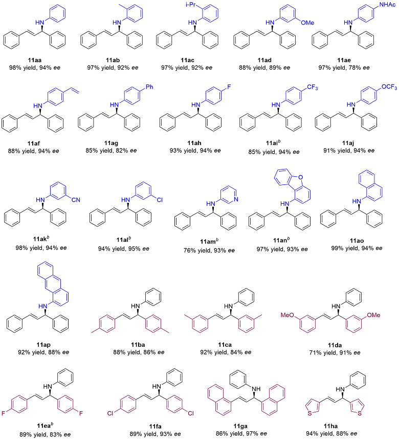 (R,E)-N-(1,3-双(3-甲氧基苯基)烯丙基)苯胺(11da): 无色油状物, 48.9 mg, 产率71%, 91% ee. [α] -36.4 (c 0.75, CH2Cl2); 1H NMR (600 MHz, CDCl3) δ: 7.27 (dd, J=7.9, 7.9 Hz, 1H), 7.20 (dd, J=7.9, 7.9 Hz, 1H), 7.16-7.12 (m, 2H), 7.02 (d, J=7.6 Hz, 1H), 6.99~6.97 (m, 1H), 6.95 (d, J=7.6 Hz, 1H), 6.90~6.88 (m, 1H), 6.82 (dd, J=8.2, 2.6 Hz, 1H), 6.78 (dd, J=8.2, 2.6 Hz, 1H), 6.70 (t, J=7.3 Hz, 1H), 6.65~6.61 (m, 2H), 6.59 (dd, J=15.9, 1.3 Hz, 1H), 6.37 (dd, J=15.8, 6.2 Hz, 1H), 5.04 (d, J=6.2 Hz, 1H), 4.11 (s, 1H), 3.79 (d, J=3.0 Hz, 6H); 13C NMR (151 MHz, CDCl3) δ: 160.0, 159.8, 147.2, 143.8, 138.1, 131.0, 130.9, 129.8, 129.5, 129.1, 119.5, 119.2, 117.7, 113.6, 113.5, 112.9, 112.8, 111.7, 60.7, 55.21, 55.20. HRMS calcd for C23H22NO2 [M-H]+ 344.1645, found 344.1646. HPLC [Chiralpak IC-H, V(n-hexane)/V(i-PrOH)=99/1, 流速=1.0 mL/min, λ=254 nm]: tR=18.73 min (major), 22.26 min (minor).