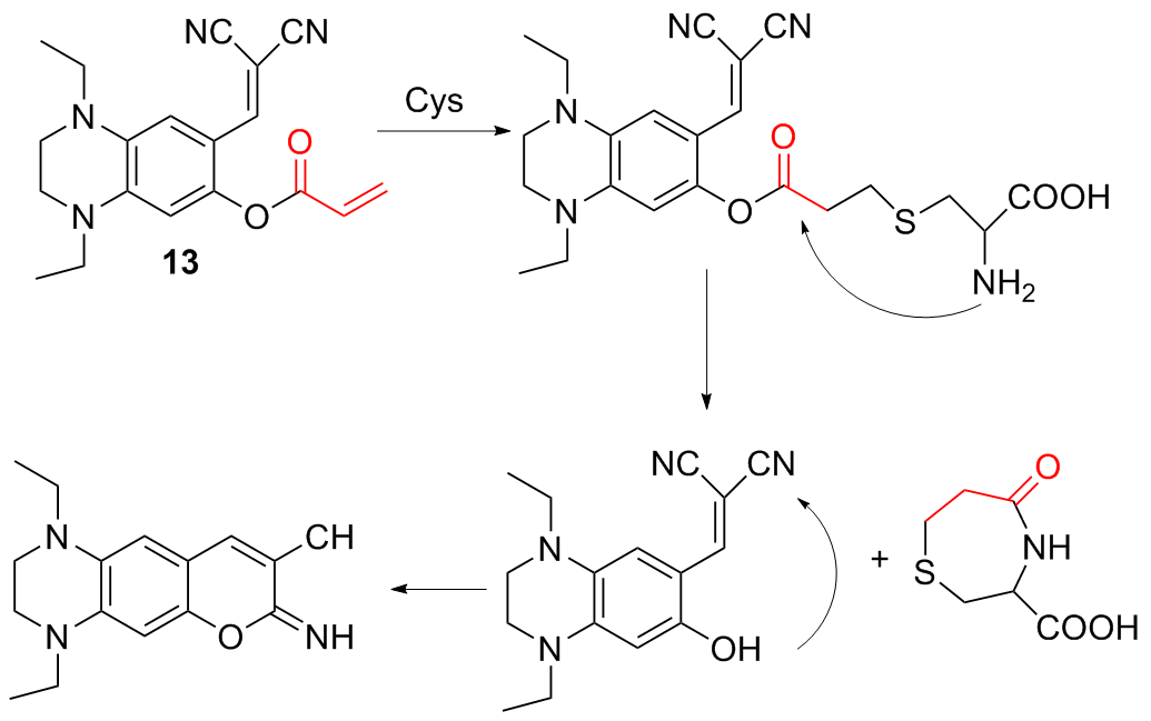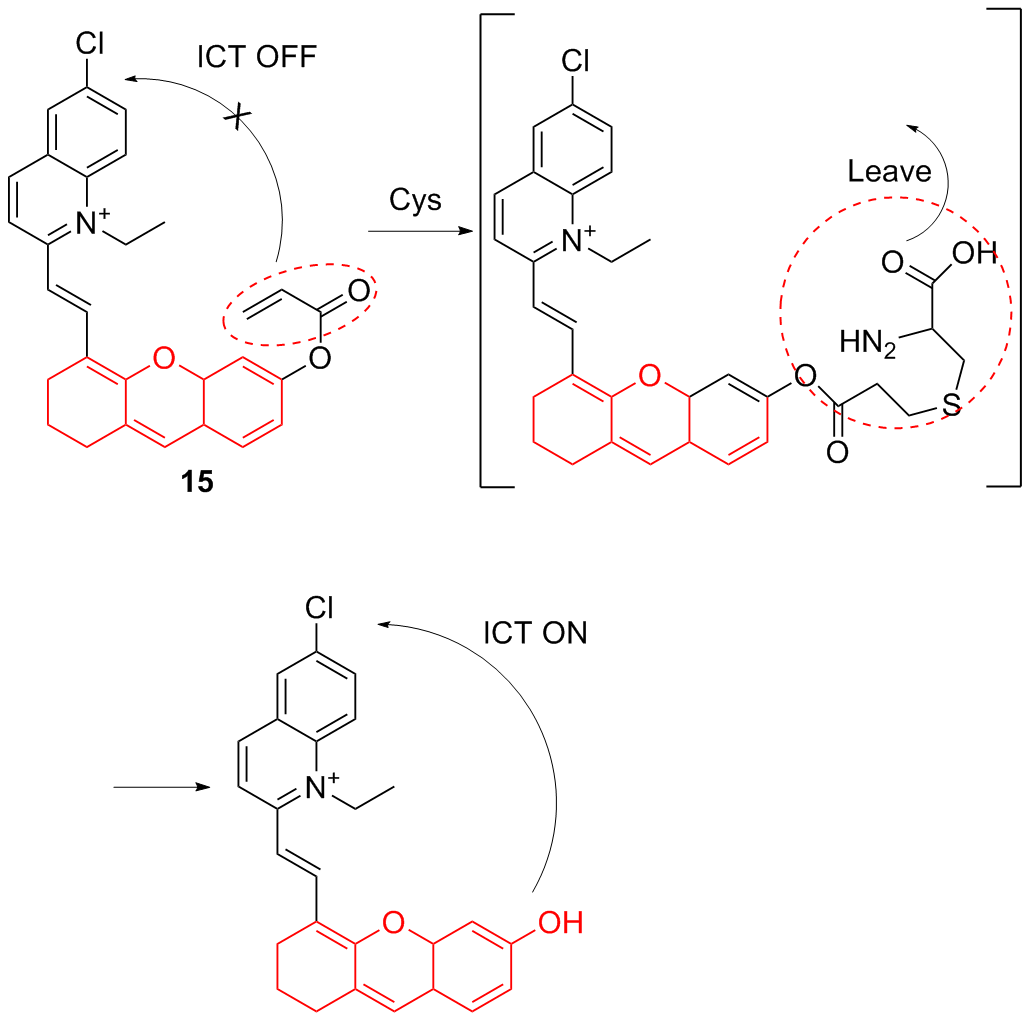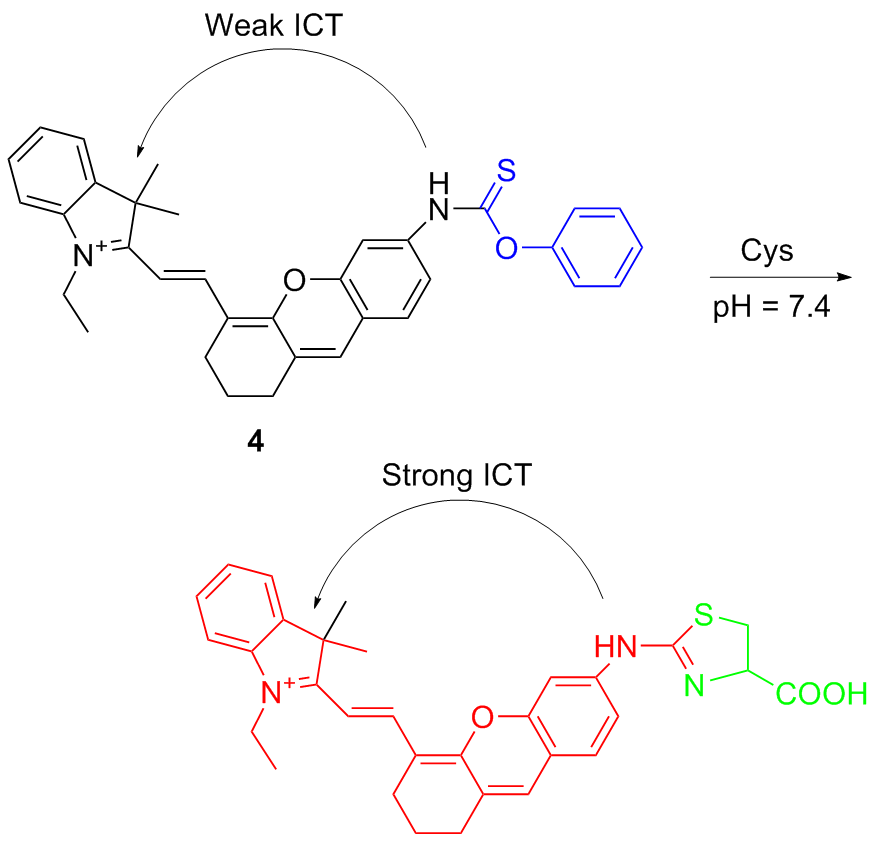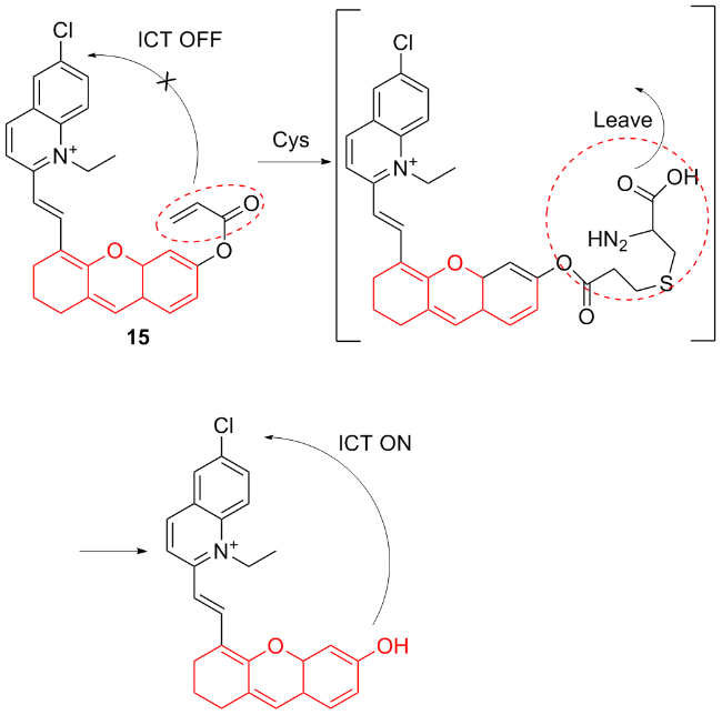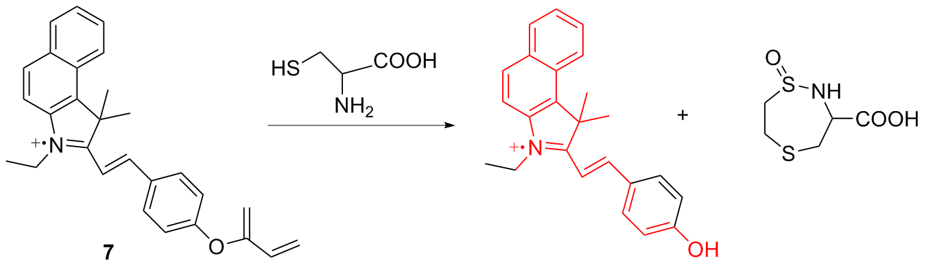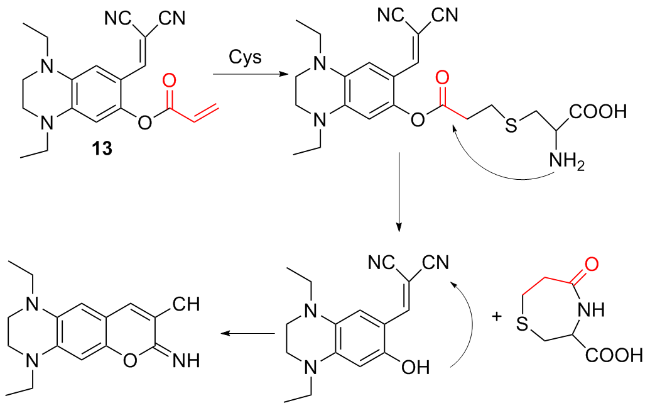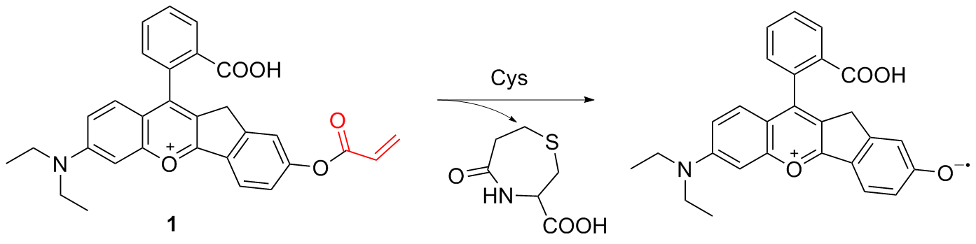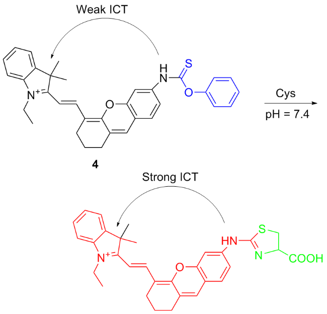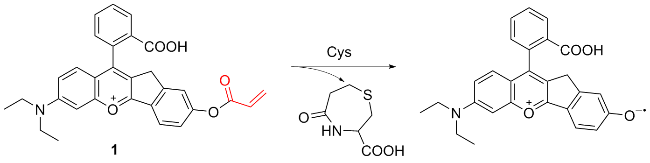 | 3 | The chlorine atom on the probe is substituted by a thiol group, followed by an intramolecular rearrangement, resulting in fluorescence emission | Enabling cysteine imaging in HepG-2 cells and zebrafish | [11] |
