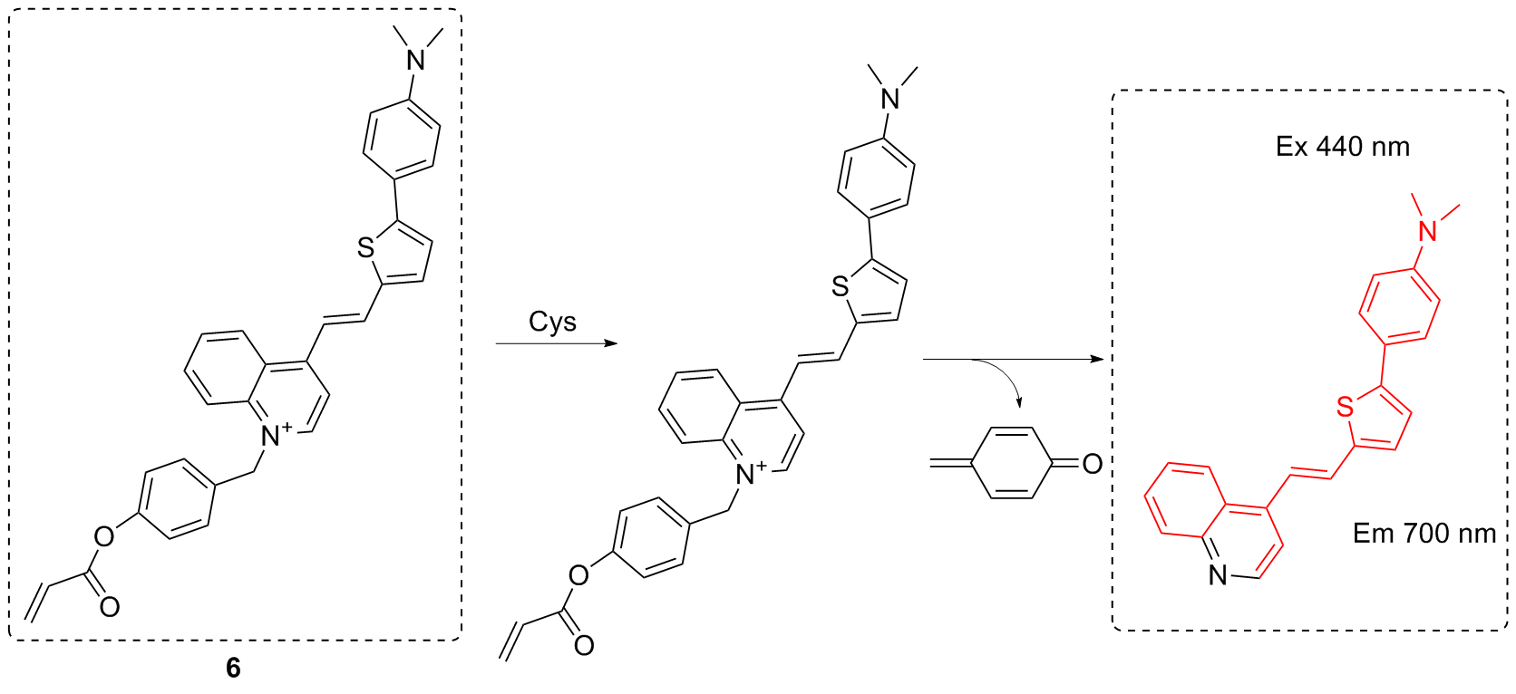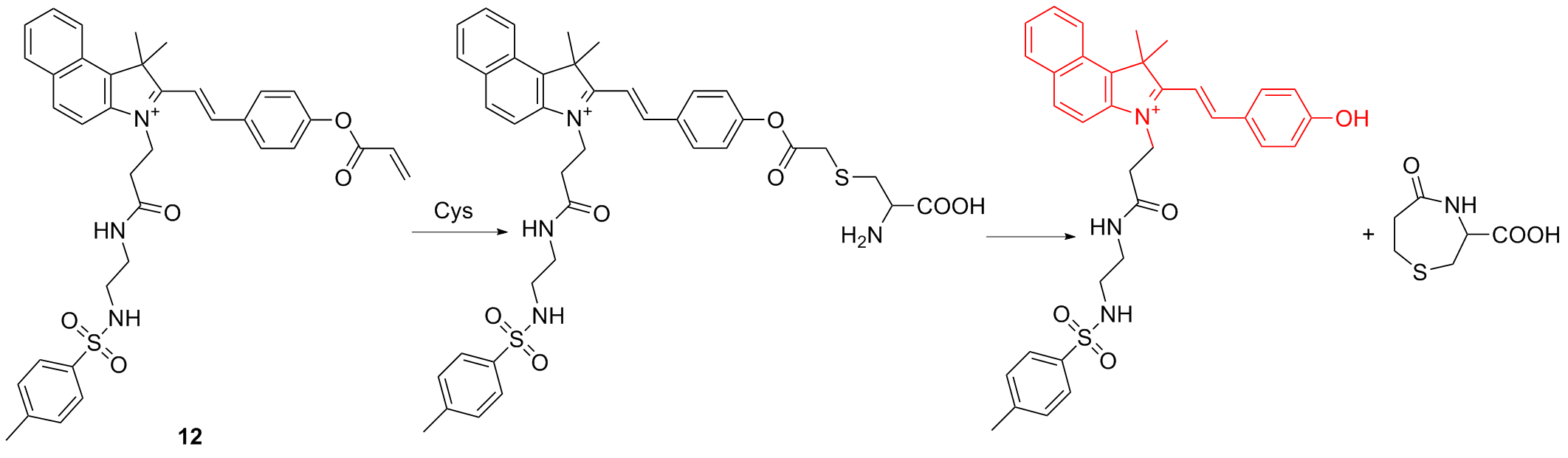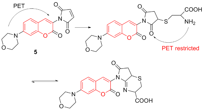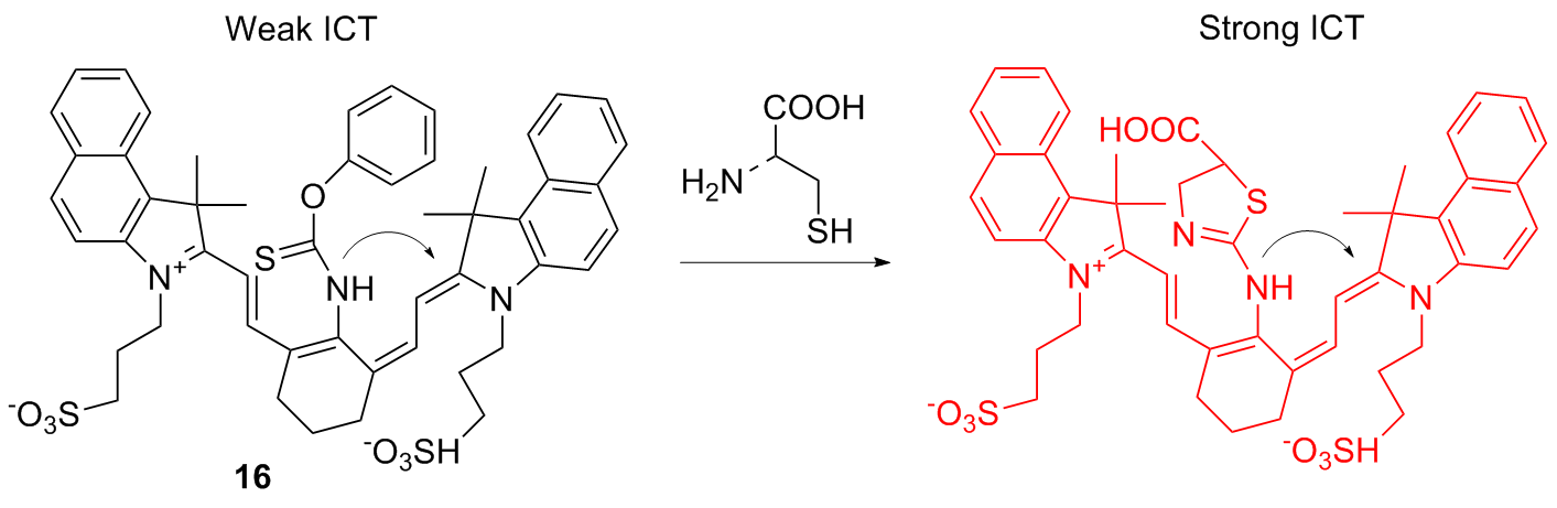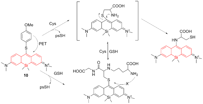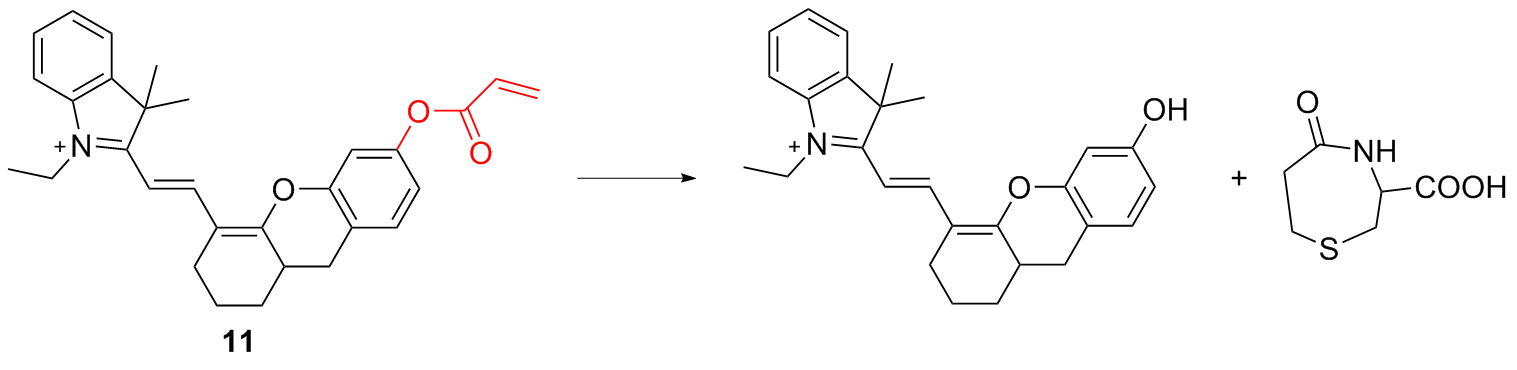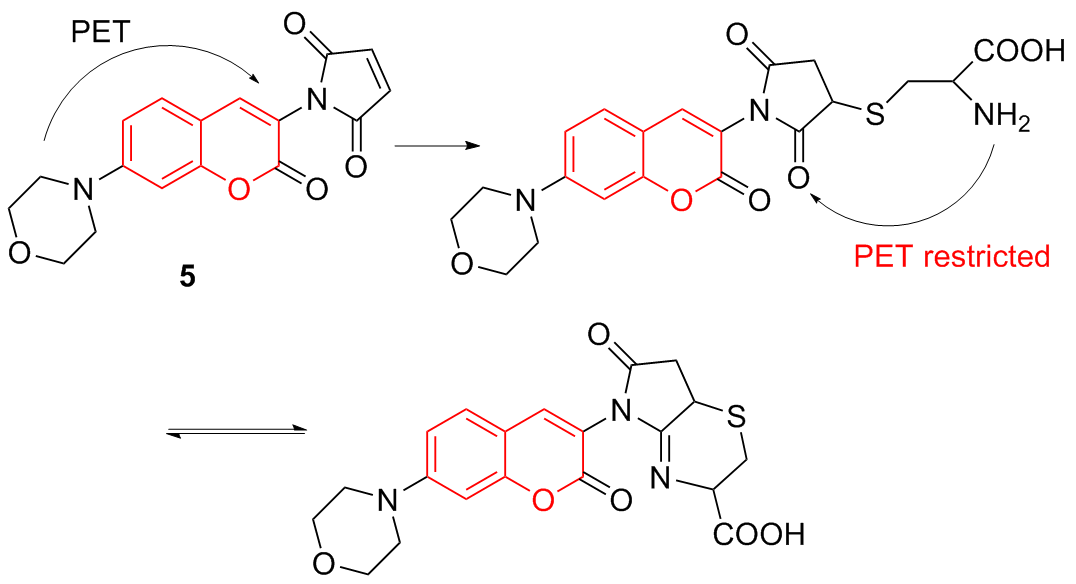 | 3 | The chlorine atom on the probe is substituted by a thiol group, followed by an intramolecular rearrangement, resulting in fluorescence emission | Enabling cysteine imaging in HepG-2 cells and zebrafish | [11] |
