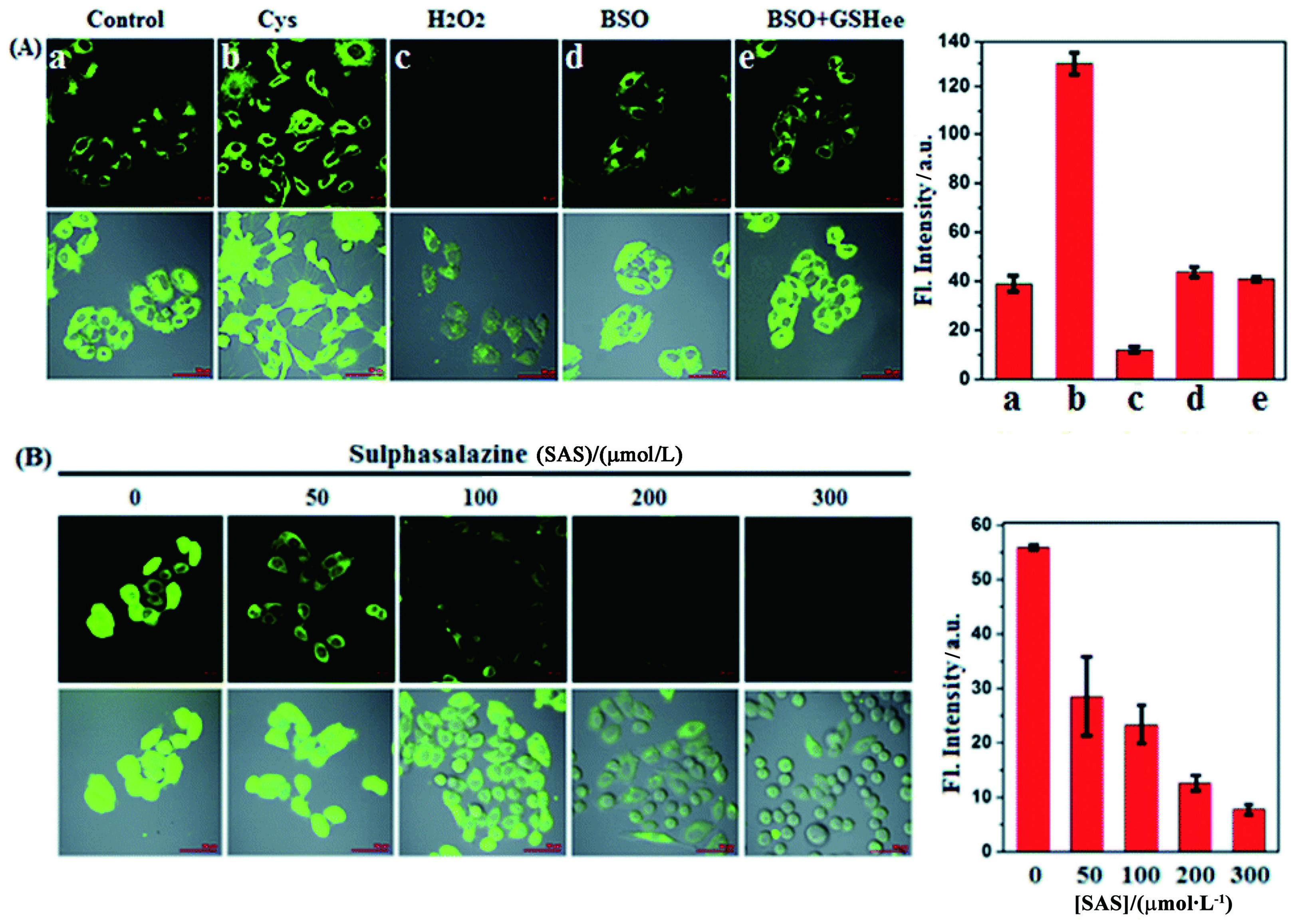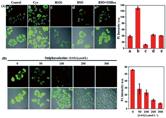 图5 (A)空白、Cys、H2O2、BSO、BSO+GSHee处理再用探针处理的Hela细胞荧光图像; (B)不同浓度的SAS预处理再用探针处理的Hela细胞荧光图像[65]Figure5 (A) Fluorescence images of Hela cells treated with blank, Cys, H2O2, BSO, BSO+GSHee and then treated with probes; (B) Fluorescence images of Hela cells pretreated with different concentrations of SAS followed by probes[65] |