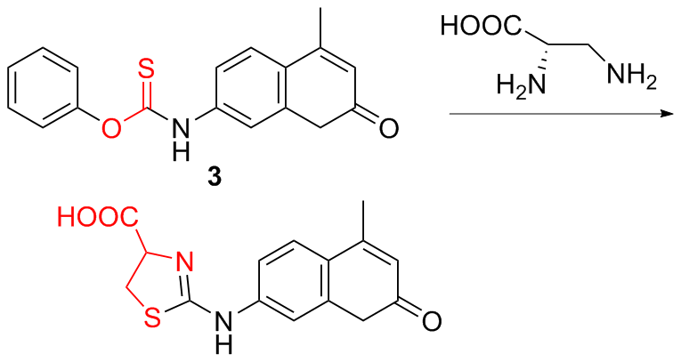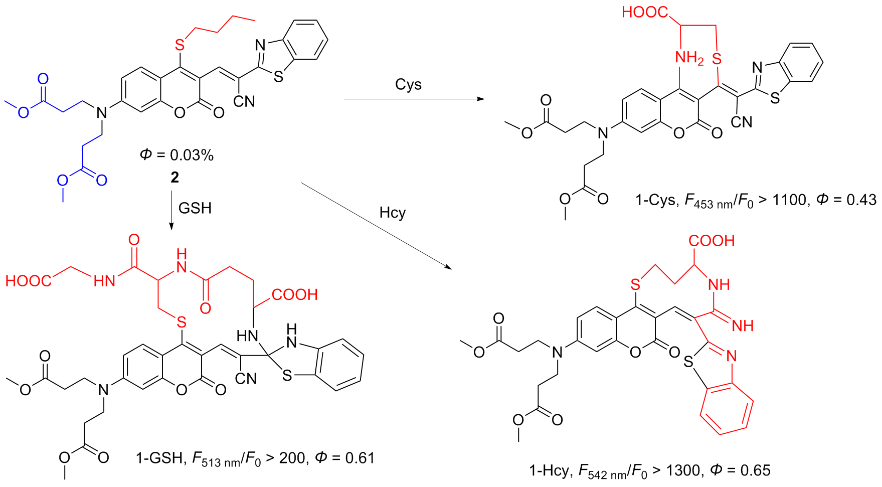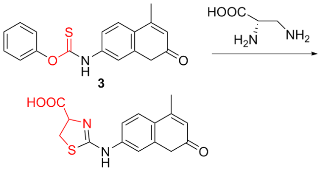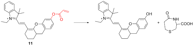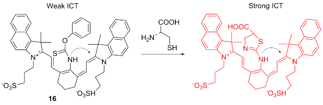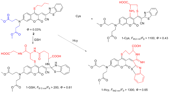 | 4 | With thiobenzoate as the responsive site and aminoquinoline dye as the fluorophore | Detecting cysteine production during stress responses | [12] |
