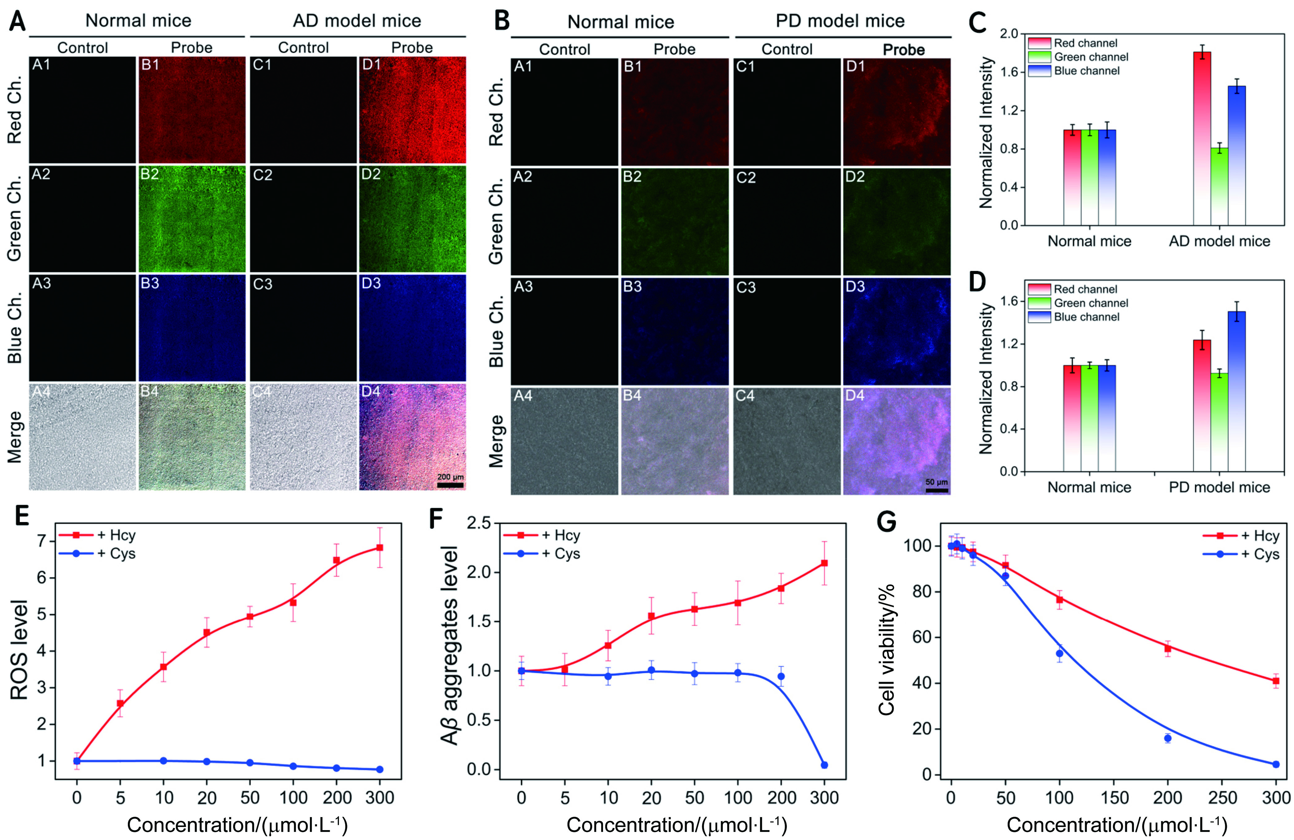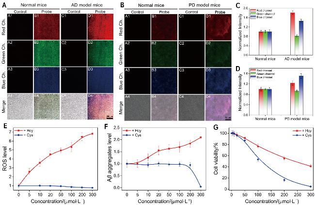 图1 (A)正常小鼠和转基因小鼠海马组织内源性Hcy、GSH和Cys的荧光成像; (B)正常小鼠和PD模型小鼠黑质组织内源性Hcy、GSH和Cys的共聚焦荧光成像; (C)图(A)中正常小鼠和转基因小鼠海马组织内源性Hcy、GSH和Cys对应的荧光强度; (D)图(B)中正常小鼠和PD模型小鼠黑质组织内源性Hcy、GSH和Cys对应的荧光强度; (E)不同浓度Hcy/Cys对细胞内活性氧的影响; (F)不同浓度Hcy/Cys对细胞Aβ聚集水平的影响; (G) MTT法测定不同浓度Hcy/Cys处理细胞1 h后的细胞活力[32]Figure 1 (A) Fluorescence imaging of endogenous Hcy, GSH, and Cys in hippocampal tissues of normal mice and transgenic mice; (B) Confocal fluorescence imaging of endogenous Hcy, GSH and Cys in substantia nigra tissues of normal mice and PD model mice; (C) Fluorescence intensities corresponding to endogenous Hcy, GSH, and Cys in the hippocampus of normal mice and transgenic mice in Figure (A); (D) Fluorescence intensities corresponding to endogenous Hcy, GSH, and Cys in substantia nigra tissues of normal mice and PD model mice in Figure (B); (E) Effect of different concentrations of Hcy/Cys on intracellular reactive oxygen species; (F) Effect of different concentrations of Hcy/Cys on the level of Aβ aggregation in cells; (G) MTT assay to determine cell viability of Hcy/Cys-treated cells at different concentrations after 12 h[32] |