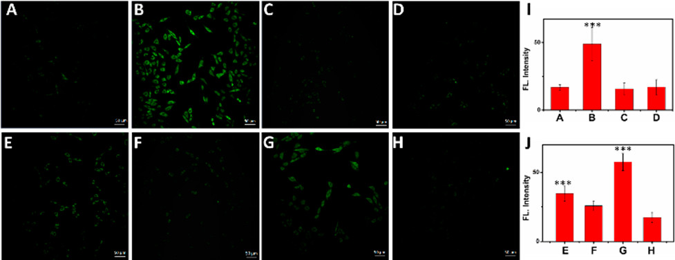 图2 PC12细胞的双光子荧光图像: (A)探针4处理组, (B) Cys组, (C) Hcy组, (D) GSH组, (E) Cys和H2O2组, (F) Cys和NEM组, (G) DTT组, (H) DTT和NEM组; (I)图(A)~(D)对应的荧光强度图; (J)图(E)~(H)对应的荧光强度图[43]Figure 2 Two-photon fluorescence image of PC12 cells: (A) probe 4 treatment group, (B) Cys group, (C) Hcy group, (D) GSH group, (E) Cys and H2O2 groups, (F) Cys and NEM groups, (G) DTT group, (H) DTT and NEM groups; (I) Fluorescence intensity plots corresponding to panels (A)~(D); (J) Fluorescence intensity plots corresponding to (E)~(H) panels[43] |
