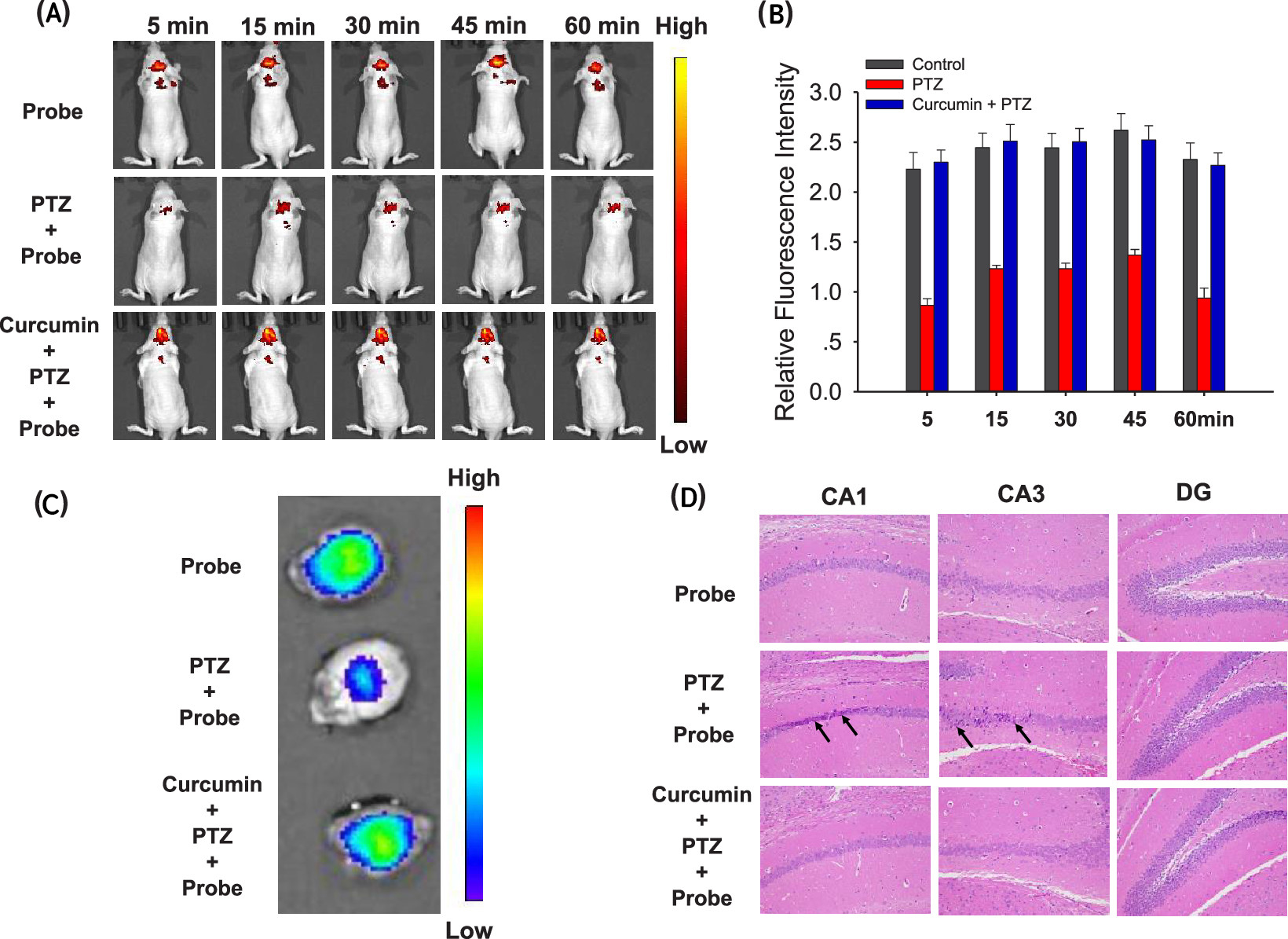 图3 (A)小鼠体内荧光成像(从上到下依次为健康小鼠、癫痫小鼠和姜黄素治疗的癫痫小鼠图像); (B)图(A)中健康小鼠、癫痫小鼠和姜黄素治疗的癫痫小鼠对应的荧光强度; (C)小鼠分离脑的荧光图像; (D)癫痫小鼠给药后海马区神经元损伤[50]Figure 3 (A) In vivo fluorescence imaging of mice (from top to bottom, images of healthy mice, epileptic mice, and curcumin-treated epileptic mice); (B) Fluorescence intensity of healthy mice, epilepsy mice, and epilepsy mice treated with curcumin in Figure (A); (C) Fluorescence image of mouse isolated brain; (D) Neuronal damage in the hippocampus after administration in epileptic mice[50] |