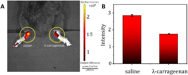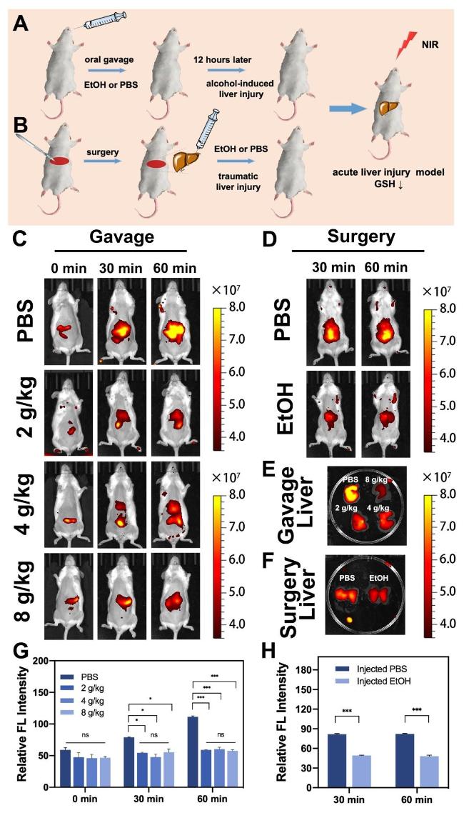 图7 (A)过量乙醇灌胃诱导ALI小鼠的示意图; (B)手术注射乙醇诱导ALI小鼠的示意图; (C)注射组ALI小鼠在0、30、60 min后的近红外荧光成像; (D)手术组ALI小鼠30、60 min后的近红外成像; (E)灌胃组离体肝脏荧光成像; (F)注射组离体肝脏的荧光成像; (G)灌胃组近红外荧光强度的半定量分析; (H)手术组近红外荧光强度的半定量分析[79]Figure 7 (A) Schematic diagram of ALI induced by over ethanol gavage; (B) Schematic diagram of ethanol-induced ALI mice surgically injected; (C) Near-infrared fluorescence imaging of ALI mice in the injection group after 0, 30, and 60 min; (D) Near-infrared imaging of ALI mice in the surgical group after 30 and 60 min; (E) Fluorescence imaging of isolated liver in the gastric perfusion group; (F) Fluorescence imaging of isolated liver in the injection group; (G) Semi-quantitative analysis of near-infrared fluorescence intensity in the gavage group; (H) Semi-quantitative analysis of near-infrared fluorescence intensity in the surgical group[79] |