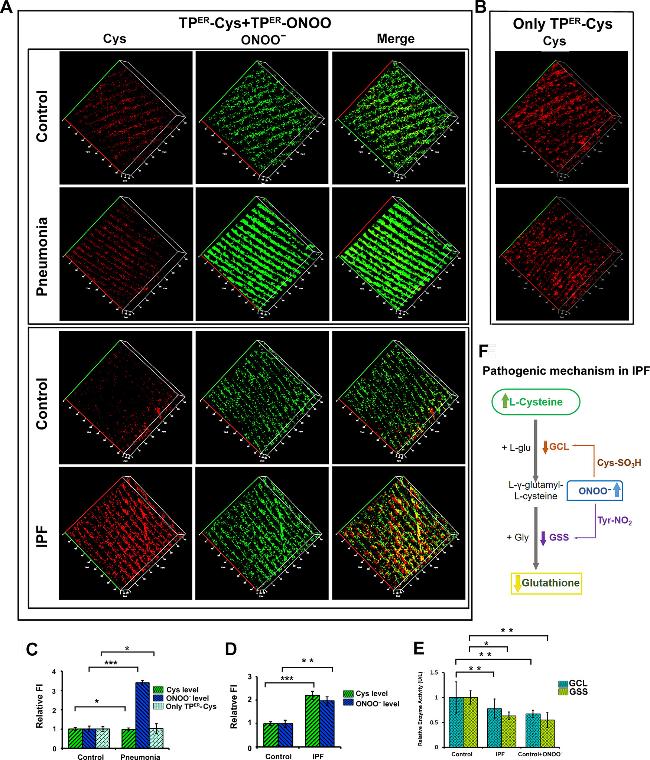 图6 (A)小鼠肺部TPER-Cys和TPER-ONOO的TP成像; (B)对照组和肺炎小鼠肺部TPER-Cys的荧光成像; (C)肺炎小鼠和对照小鼠肺组织的相对荧光强度; (D)肺纤维化和对照小鼠肺组织的相对荧光强度; (E)小鼠肺中GCL和GSS酶的相对活性; (F)肺纤维化中GSH合成的可能信号通路[70]Figure 6 (A) TP imaging of TPER-Cys and TPER-ONOO in mouse lungs; (B) Fluorescence imaging of TPER-Cys in the lungs of control and pneumonia mice; (C) Relative fluorescence intensity of lung tissue from pneumoniac mice and control mice; (D) Relative fluorescence intensity of lung fibrosis and control mouse lung tissue; (E) Relative activities of GCL and GSS enzymes in mouse lungs; (F) Possible signaling pathways for GSH synthesis in pulmonary fibrosis[70] |