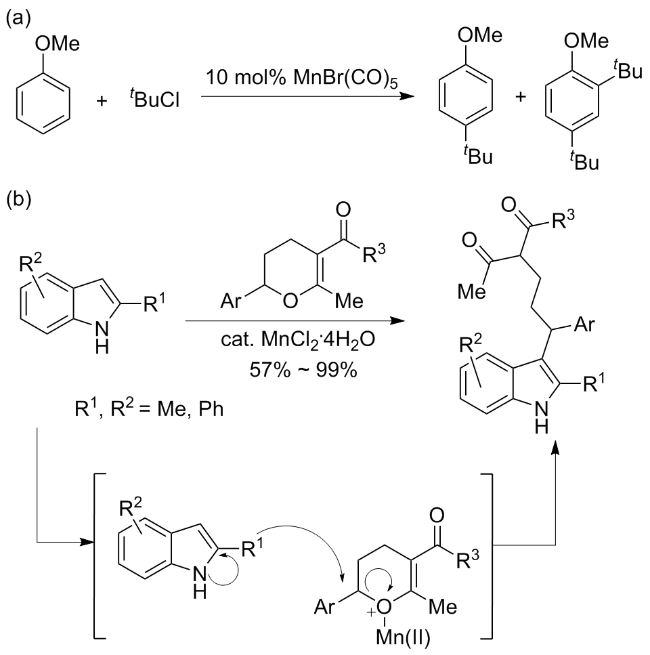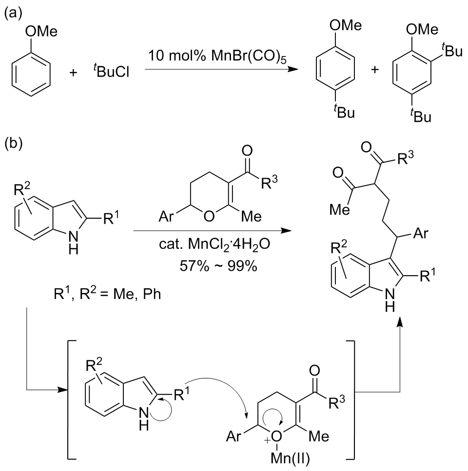 In recent years, the use of abundant, cheap and less toxic manganese as catalysts for coupling reactions in organic synthesis has attracted widespread attention. This article aims to review the application of manganese catalysts in coupling reactions, focusing on their performance in the formation of carbon-carbon bond and carbon-heteroatom bond. By analyzing the manganese-catalyzed dehydrogenative coupling reactions, cross-coupling reactions and their combined catalysis with other metals, the potential of manganese catalysis in the synthesis of complex molecules is demonstrated. This article summarizes the various coupling reaction mechanisms of manganese reagents and explores the key role of additives in the reaction. Studies have shown that manganese catalysts have the characteristics of high efficiency, good selectivity and environmental friendliness, especially in the acceptor-free dehydrogenative coupling reaction, which shows excellent catalytic activity although there is still a broad space for development in its mechanism exploration and additive optimization. As a sustainable resource, manganese has broad prospects for application in organic synthesis in the future.