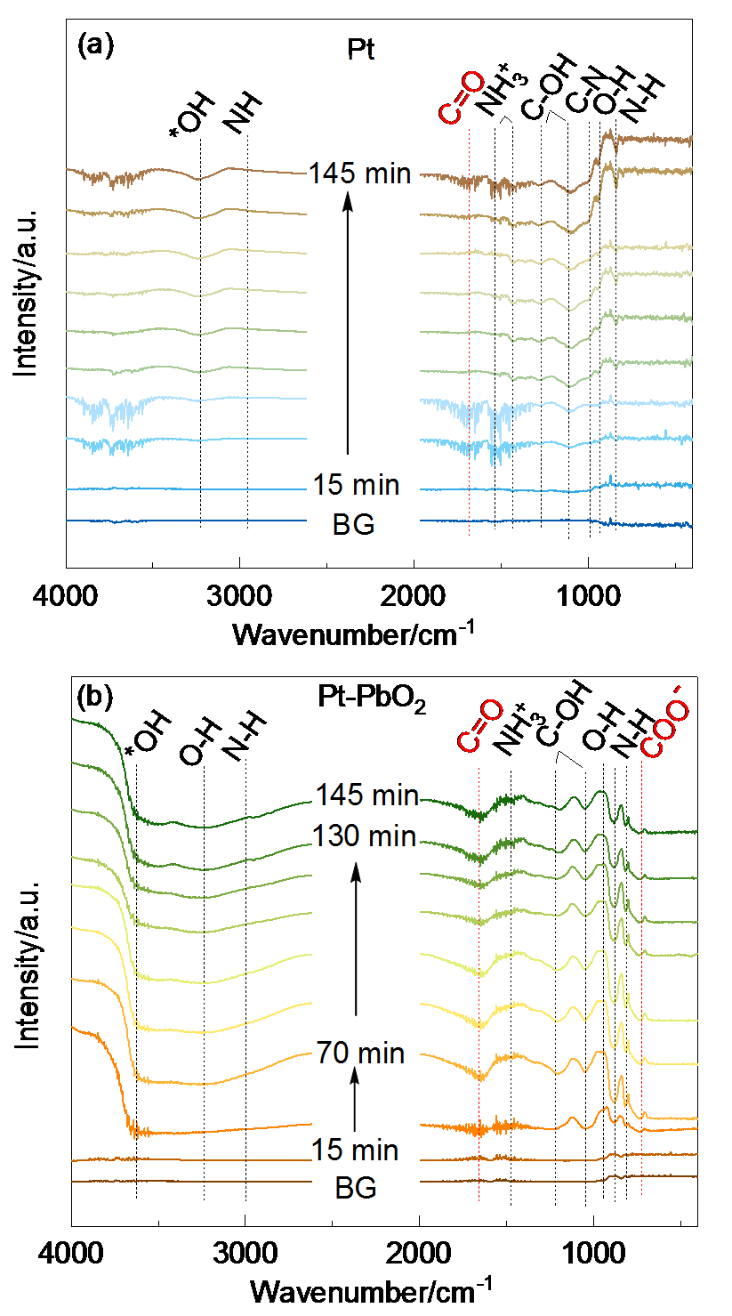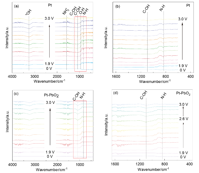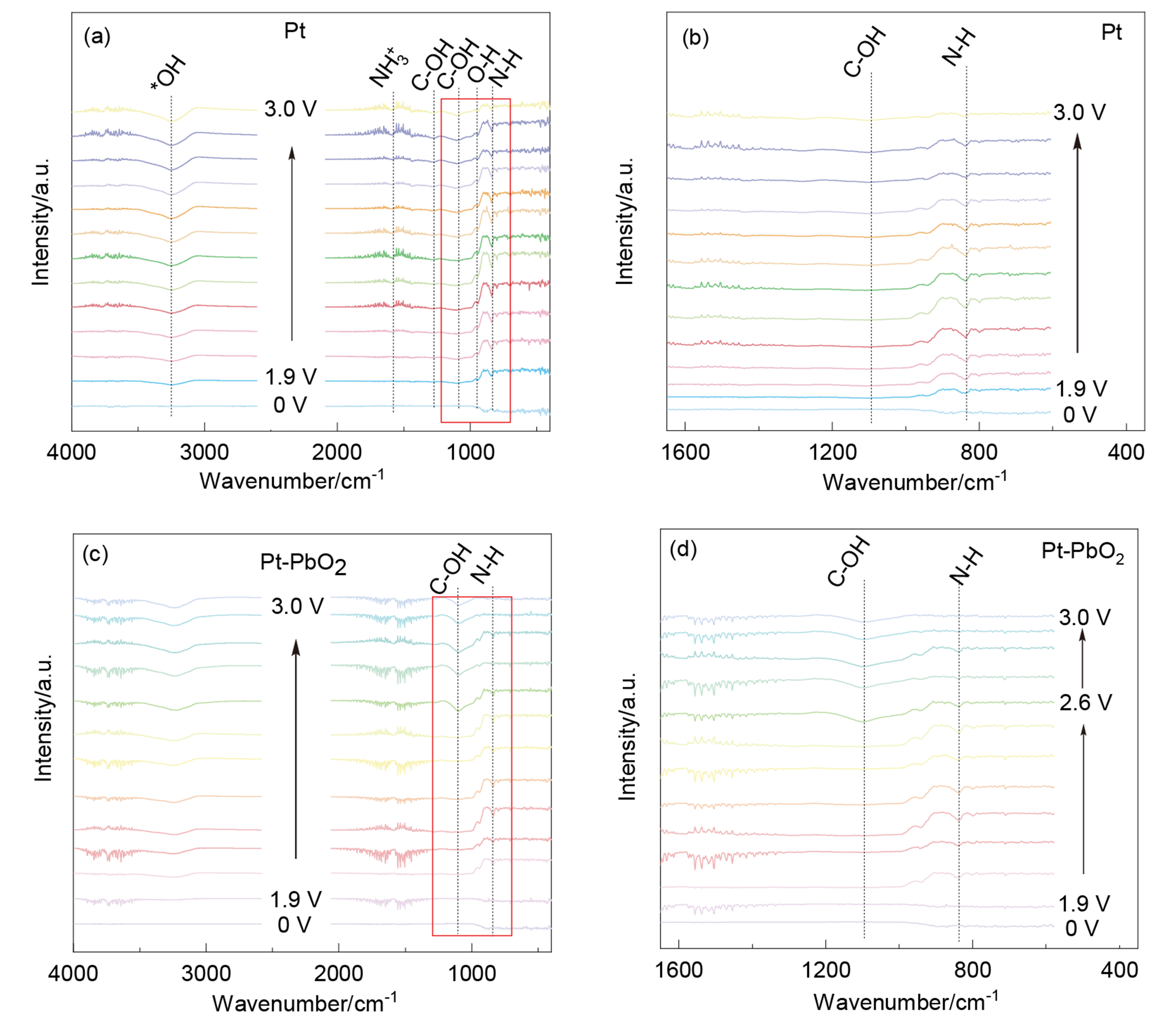 图5 电位为1.9~3.0 V时Pt电极(a, b)和Pt-PbO2电极(c, d)在0.3 mol/L MEA+2.0 mol/L H2SO4溶液中的原位多步阶跃红外光谱图(vs. Ag/AgCl) (图b、d分别为图a、c中对应红框中的放大图)Figure 5 In-situ multi-step staircase infrared spectroscopy of Pt electrode (a, b) and Pt-PbO2 electrode (c, d) in 0.3 mol/L MEA+2.0 mol/L H2SO4 solution at the research potential of 1.9~3.0 V (vs. Ag/AgCl) (b and d are the enlarged view of Figures a and c) |