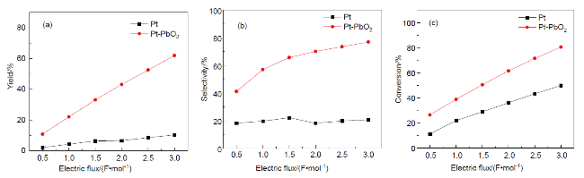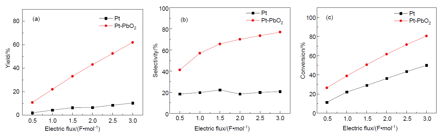表1 Pt、PbO2和Pt-PbO2对Gly收率、Gly选择性、MEA转化率和法拉第效率的影响Table 1 Influence of Pt, PbO2 and Pt-PbO2 on the yield of Gly, selectivity of Gly, MEA conversion, and Faraday efficiency |
