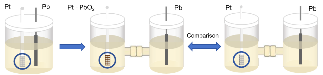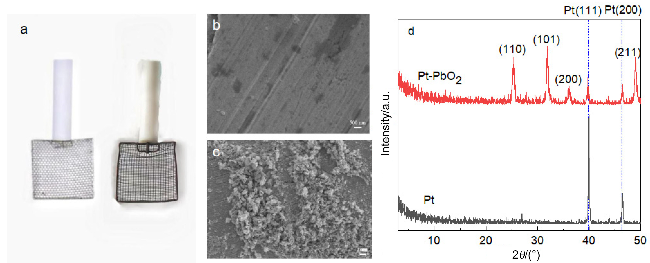 图3 (a)铅作为阴极时无隔膜电解前后铂阳极的对比图; (b)无隔膜电解前的Pt电极的SEM图和(c)无隔膜电解后的Pt电极的SEM图; (d)无隔膜电解前后的Pt电极的XRD分析图Figure 3 (a) Comparison diagram of the Pt anode before and after undivided electrolysis with lead as the cathode; (b) SEM image of the Pt electrode before undivided electrolysis and (c) SEM image of the Pt electrode after undivided electrolysis; (d) XRD patterns of the Pt electrode before and after undivided electrolysis |