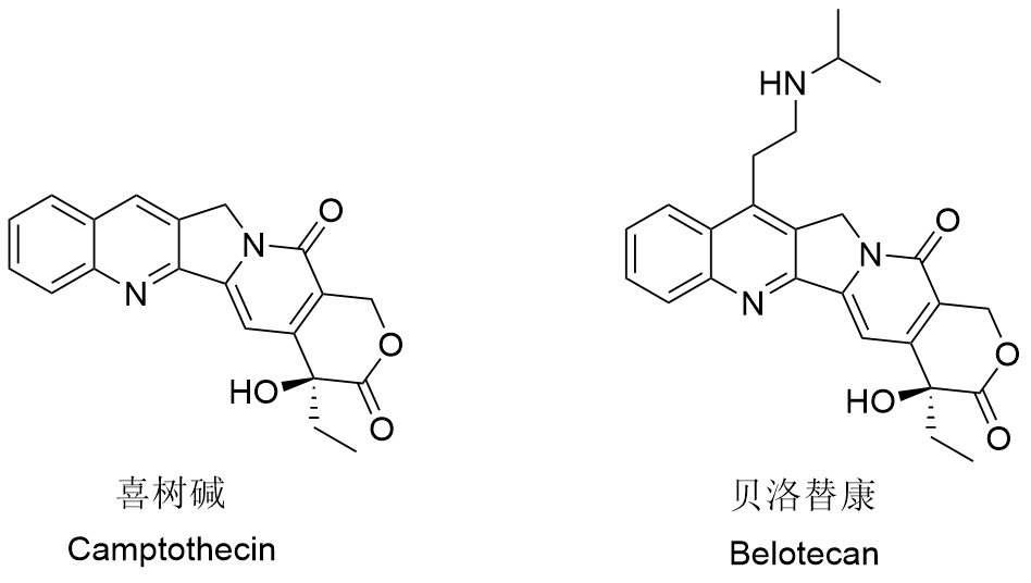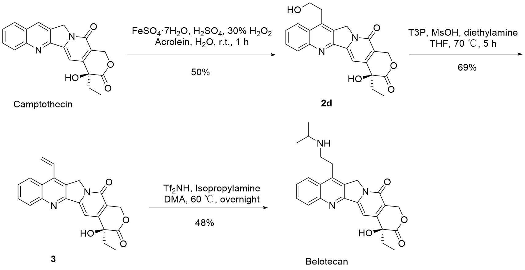在3 mL密封反应瓶中加入化合物3 (20 mg, 0.05 mmol)、DMA (0.8 mL)和Tf2NH (6 mg, 0.02 mmol), 搅拌溶解为黄色溶液. 搅拌5 min后加入异丙胺(28 μL, 0.32 mmol), 密封反应瓶, 在60 ℃下反应过夜. 反应结束后反应液经反向纯化[Luna C18, 21.2 mm×250 mm, 10 μm, acetonitrile/trifluoroacetic acid aq. (ϕ=0.05%), V:V=10:90 (5 min)~42:58 (27 min)~90:10 (5 min), 25 ℃, 20 mL/min, 254 nm]得到贝洛替康(11 mg, 纯度99%, 收率47.50%). 1H NMR (400 MHz, DMSO-d6) δ: 8.82 (s, 1H), 8.32 (d, J=8.4 Hz, 1H), 8.21 (d, J=8.4 Hz, 1H), 7.90 (t, J=7.7 Hz, 1H), 7.78 (t, J=7.6 Hz, 1H), 7.36 (s, 1H), 6.58 (s, 1H), 5.46 (s, 2H), 5.40 (s, 2H), 3.56 (s, 2H), 3.39 (dq, J=12.2, 6.0 Hz, 1H), 3.27~3.25 (m, 2H), 1.94~1.83 (m, J=7.2 Hz, 2H), 1.26 (d, J=6.4 Hz, 6H), 0.89 (t, J=7.3 Hz, 3H); 13C NMR (101 MHz, DMSO-d6) δ: 172.95, 157.31, 152.53, 150.57, 148.91, 146.21, 139.08, 130.73, 130.50, 130.26, 128.49, 127.20, 124.26, 119.65, 97.31, 72.86, 65.73, 50.39, 50.31, 43.47, 30.77, 26.64, 19.27, 19.23, 8.24; HRMS (ESI) calcd for C25H28N3O4 [M+H]+ 434.20743, found 434.20637.