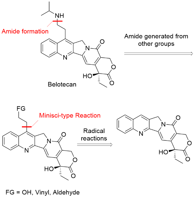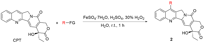 将喜树碱(30 mg, 0.086 mmol)分散于3 mL水中, 在冰浴下滴加0.76 mL浓硫酸, 使喜树碱完全溶解. 在室温下向体系中加入FeSO4•7H2O (42 mg, 0.15 mmol), 搅拌5 min后加入自由基源(1.29 mmol). 将体系移入冰浴, 滴加质量分数为30%的H2O2 (35 μL, 1.14 mmol), 过程中控制内温<20 ℃. 反应30 min后补加FeSO4•7H2O (42 mg, 0.15 mmol), 搅拌5 min后将体系移入冰浴, 滴加质量分数为30%的H2O2 (35 μL, 1.14 mmol), 过程中控制内温<20 ℃, 继续反应30 min. 反应结束后加入质量分数为30%的NaOH水溶液淬灭反应, 过滤析出的固体, 水相以乙酸乙酯(EA)萃取(5 mL×3), 浓缩, 除特别说明外, 所得粗产物均采用Flash柱纯化[二氯甲烷/甲醇, V:V=20:1~10:1]进行纯化, 得固体2.