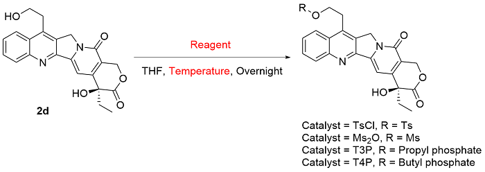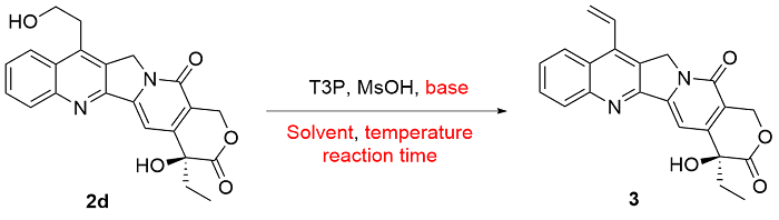 将化合物2d (133 mg, 0.3 mmol)分散于4.39 mL THF中, 向混悬液中加入T3P (667 mg, 1.05 mmol, 50% EA溶液), 室温搅拌5 min后, 加入MsOH (136 μL, 2.10 mmol)和二乙胺(194 μL, 2.39 mmol), 70 ℃反应5 h. 反应结束后加入水淬灭, 过滤析出的黄色固体, 以水, MTBE打浆处理, 过滤得橙色固体(75 mg, 收率68.77%). m.p.>250 ℃; 1H NMR (400 MHz, DMSO-d6) δ: 8.32 (dd, J=8.6, 1.3 Hz, 1H), 8.20 (dd, J=8.4, 1.2 Hz, 1H), 7.89 (ddd, J=8.4, 6.7, 1.3 Hz, 1H), 7.75 (ddd, J=8.3, 6.8, 1.3 Hz, 1H), 7.58 (dd, J=17.7, 11.7 Hz, 1H), 7.36 (s, 1H), 6.56 (s, 1H), 6.16~6.05 (m, 2H), 5.45 (s, 2H), 5.40 (s, 2H), 1.87 (dq, J=14.0, 7.0 Hz, 2H), 0.89 (t, J=7.3 Hz, 3H); HRMS (ESI) calcd for C22H19N2O4 [M+H]+ 375.13393, found 375.13242.