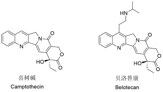 (S)-4-乙基-4-羟基-11-(羟甲基)-1,12-二氢-14H-吡喃[3',4':6,7]吲哚唑[1,2-b]喹啉-3,14(4H)-二酮化合物(2e): 自由基源为甲醇, 产物为白色固体(16 mg, 产率49.10%). m.p.>250 ℃; 1H NMR (400 MHz, DMSO-d6) δ: 8.18 (dd, J=3.9, 1.3 Hz, 1H), 8.16 (dd, J=3.9, 1.2 Hz, 1H), 7.85 (ddd, J=8.4, 6.8, 1.3 Hz, 1H), 7.70 (ddd, J=8.3, 6.8, 1.3 Hz, 1H), 7.34 (s, 1H), 6.54 (s, 1H), 5.84 (t, J=5.4 Hz, 1H), 5.44 (s, 2H), 5.40 (s, 2H), 5.28 (d, J=5.3 Hz, 2H), 1.95~1.81 (m, J=7.1 Hz, 2H), 0.87 (t, J=7.3 Hz, 3H); 13C NMR (101 MHz, DMSO-d6) δ: 173.00, 157.30, 153.15, 150.47, 148.45, 145.79, 143.68, 130.51, 130.13, 127.99, 127.34, 125.87, 124.64, 119.46, 96.98, 72.89, 65.75, 59.78, 51.20, 30.71, 8.29; HRMS (ESI) calcd for C21H19N2O5 [M+H]+ 379.12855, found 379.12788.