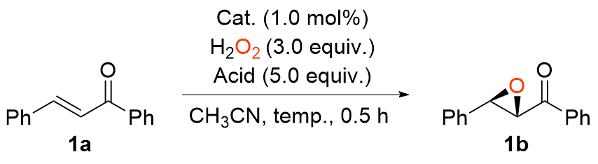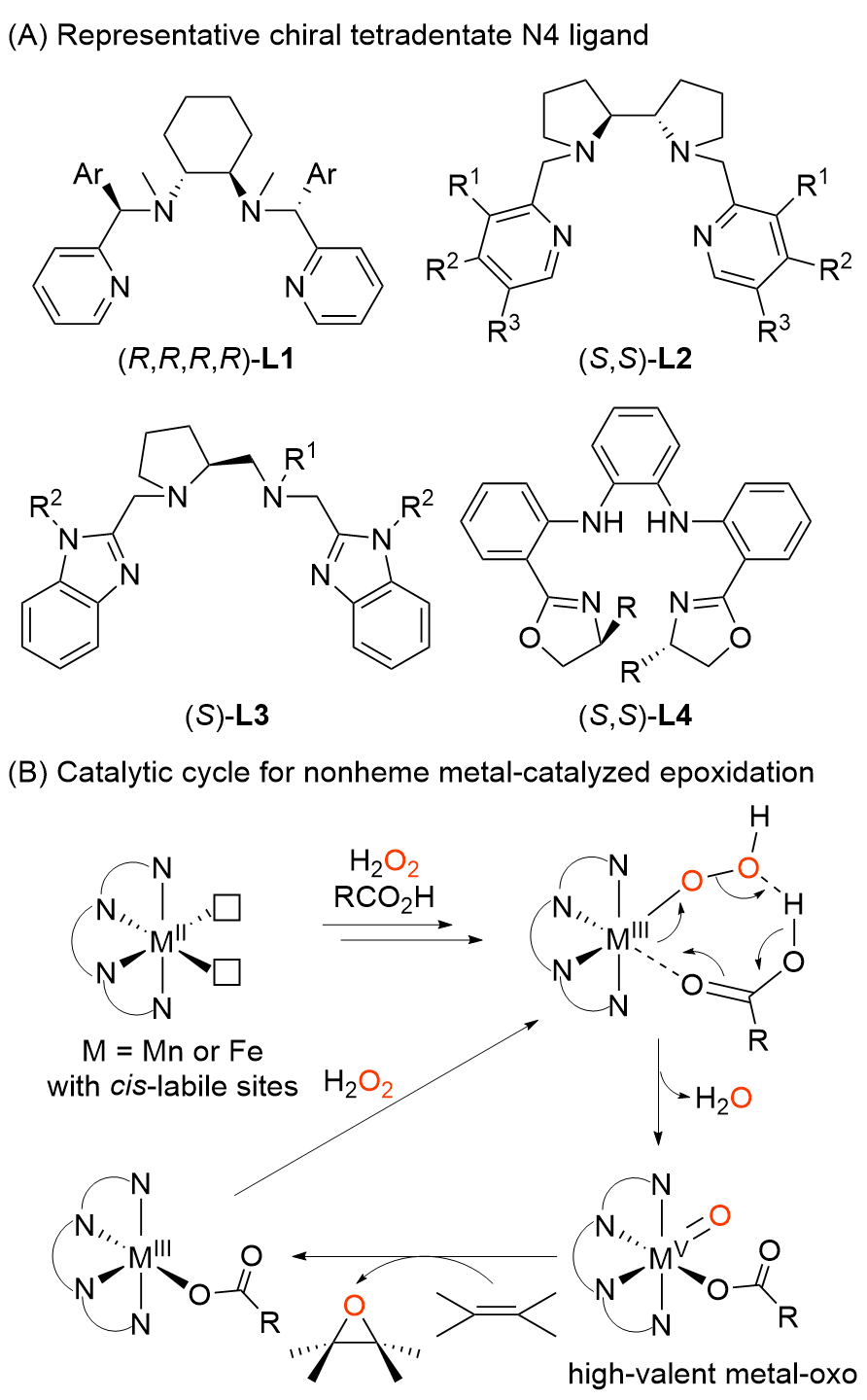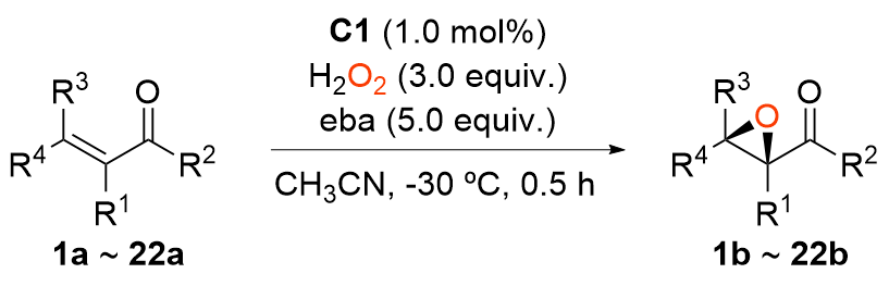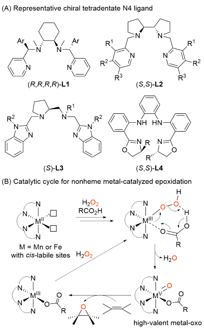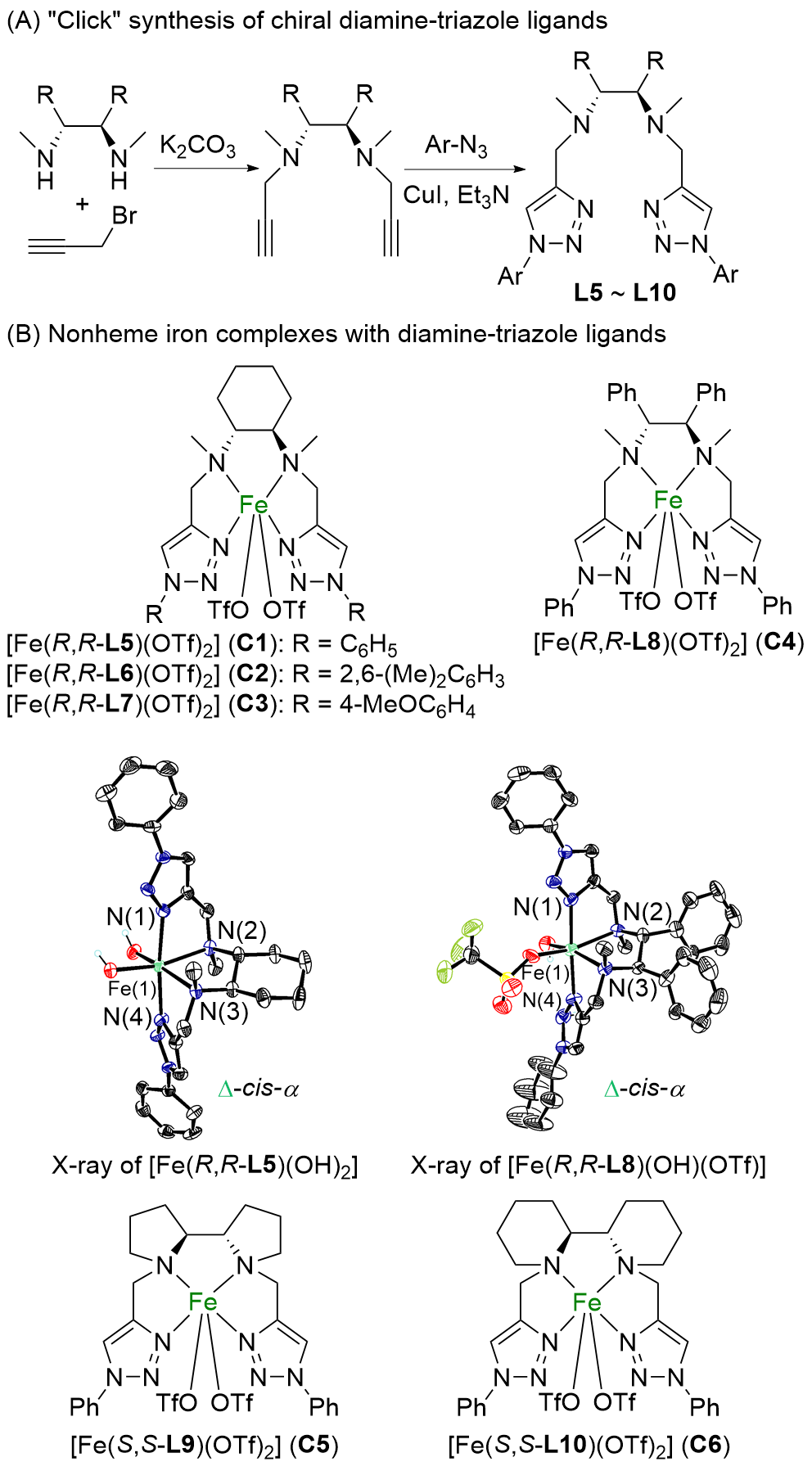 Under a nitrogen atmosphere, a solution of Fe(CF3SO3)2• (CH3CN)2 (1.2 mmol, 523 mg) in anhydrous CH3CN (2.0 mL) was added dropwise to a vigorously stirred solution of tetradentate N4 ligand (R,R)-L5 (1.0 mmol, 456 mg) in CH3CN (1.5 mL) at room temperature. After stirring for 12 h, anhydrous diethyl ether freshly taken from solvent delivery system was added to the resulting solution to precipitate out the complex. The resultant solid was washed thoroughly with ether, dried under vacuum, and recrystalized with CH3CN/ether to yield the desired complex [Fe(R,R-L5)(OTf)2] (C1) as a white solid (689 mg, 0.85 mmol, 85% yield). HRMS (ESI+) calcd for C27H32F3Fe- N8O3S [M-OTf]+ 661.1620, found 661.1626. Single crystals suitable for X-ray crystallographic analysis were obtained by slow diffusion of anhydrous diethyl ether into a THF/CH2Cl2 (V∶V=2∶1) solution of [Fe(R,R-L5)- (OTf)2] (C1). CCDC 2426118 contains the supplementary crystallographic data for this paper.