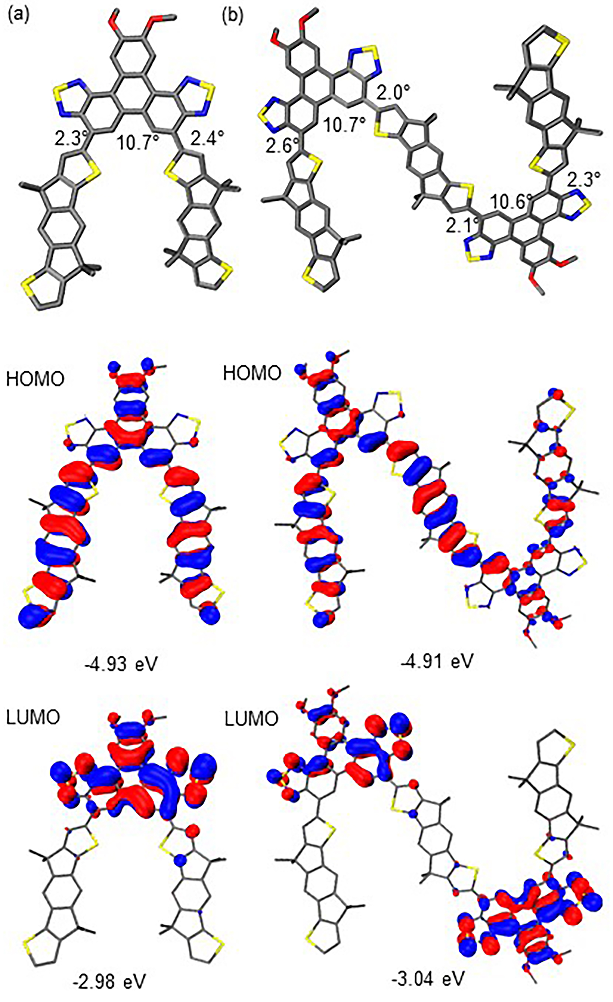 . a The maximum absorption and emission wavelengths measured in CH2Cl2. b The maximum emission wavelength measured in CH2Cl2. c Optical band gaps calculated from the onset wavelength of the absorption spectra using the equation Egopt=1240/λonset. d Frontier molecular orbital energy levels from cyclic voltammetry were estimated as: EHOMOcv (eV)=-(Eonsetox-EFc/Fc++4.8) (eV), ELUMOcv (eV)=-(Eonsetred-EFc/Fc++4.8) (eV). e Fluorescence lifetime (τs). f Absolute quantum yield measured in the solid state. g Absolute quantum yield measured in CH2Cl2. h Radiative (kr) and nonradiative (knr) decay rate constants calculated by the equations kr=ΦFL-solution/τs and knr=(1-ΦFL-solution)/τs. |