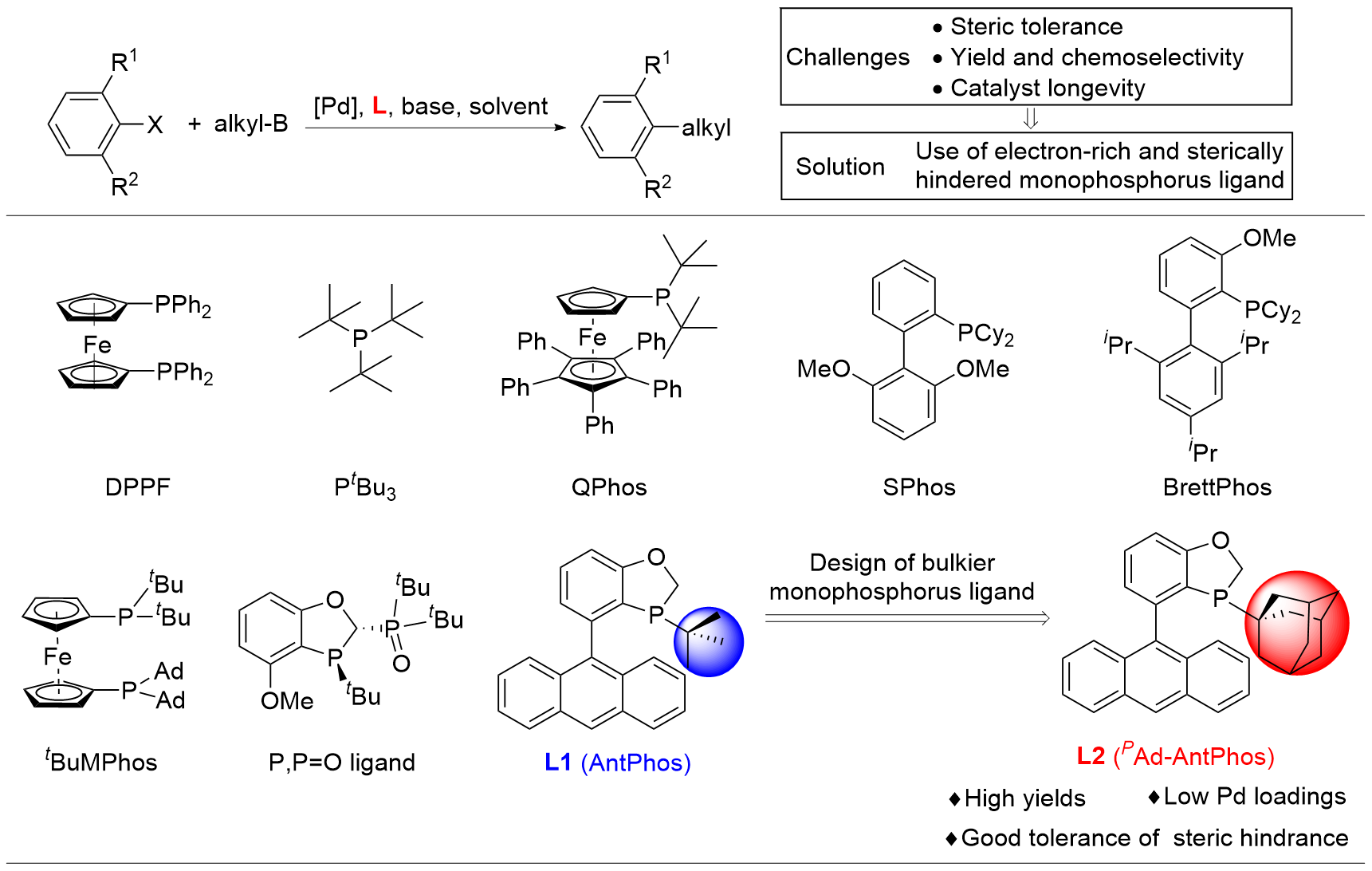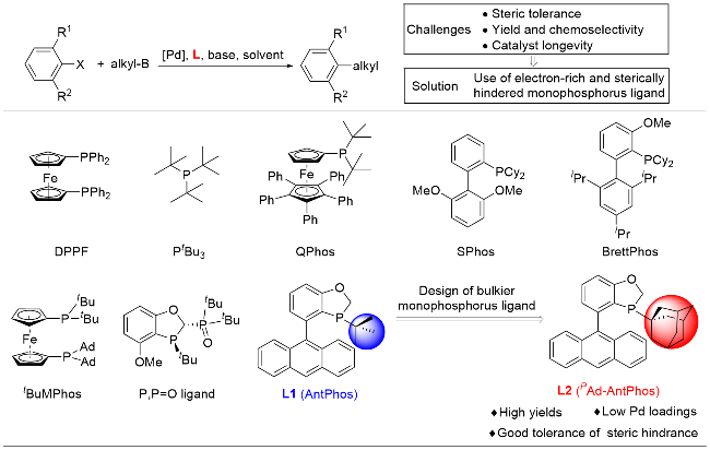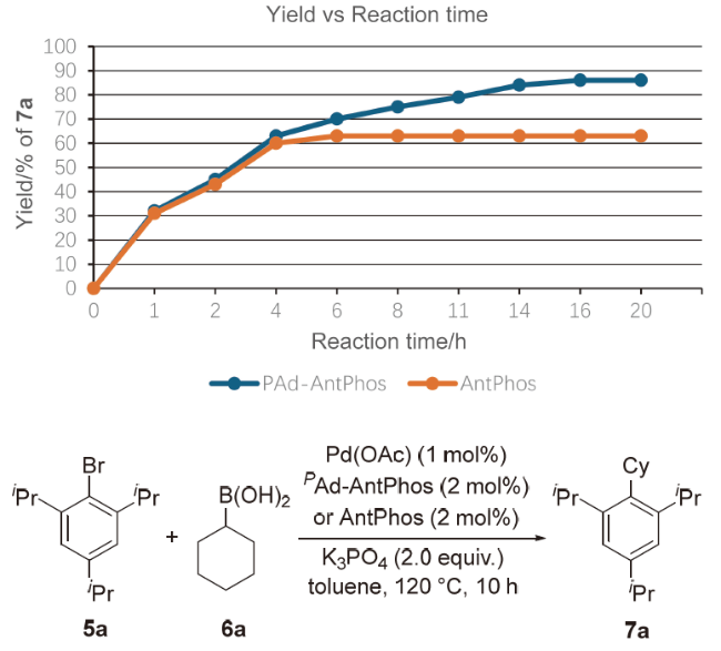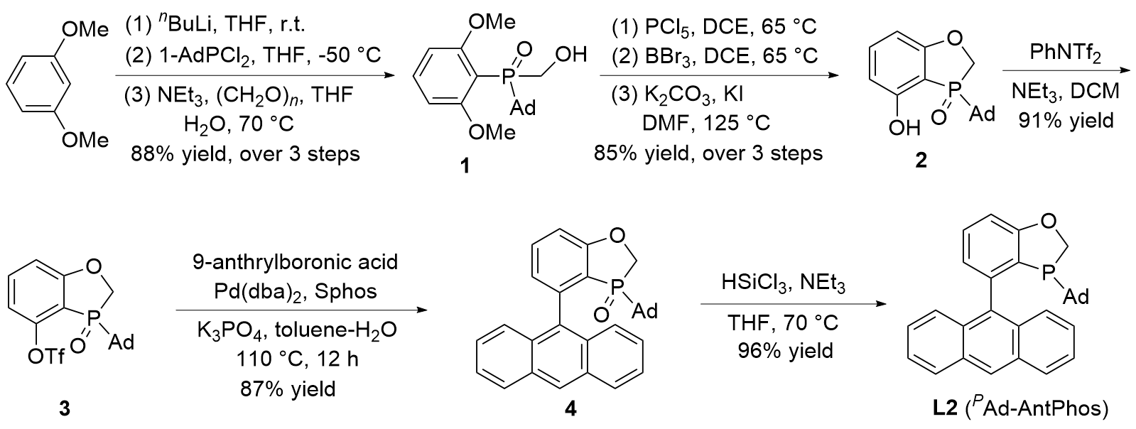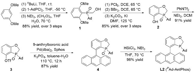 取一干净的100 mL史莱克管加入化合物4 (0.8 g)后, 抽换氮气三次, 依次加入四氢呋喃(10 mL)、三乙胺(1 mL)和三氯硅烷(0.4 mL). 体系在70 ℃下加热反应6 h, 利用31P NMR检测反应. 反应完成后在0 ℃下加入氢氧化钠溶液(30%, 15 mL), 反应体系在65 ℃下搅拌2 h. 加入甲叔醚, 用甲叔醚(15 mL×3)萃取, 合并有机相, 饱和食盐水(50 mL)洗涤, 无水硫酸钠干燥, 柱层析[洗涤剂: V(乙酸乙酯):V(乙醚)=1:10, 250 mL]得到PAd- Ant-Phos (L2): 743 mg, 96% yield. 1H NMR (500 MHz, CDCl3) δ: 8.49 (s, 1H), 8.07~7.98 (m, 2H), 7.92 (d, J=8.5 Hz, 1H), 7.80 (d, J=8.5 Hz, 1H), 7.48 (t, J=7.4 Hz, 2H), 7.45~7.36 (m, 3H), 7.14~7.01 (m, 2H), 4.94 (d, J=12.4 Hz, 1H), 4.53 (dd, J=26.2, 12.5 Hz, 1H), 1.45~1.37 (m, 4H), 1.28 (d, J=12.1 Hz, 5H), 1.06 (d, J=11.6 Hz, 3H), 0.94 (d, J=11.6 Hz, 3H); 13C NMR (126 MHz, CDCl3) δ: 164.20 (s), 142.34 (d, J=17.1 Hz), 136.53 (s), 131.35 (d, J=14.6 Hz), 130.92 (s), 130.83 (s), 128.91 (s), 128.43 (d, J=28.1 Hz), 128.14 (s), 127.22 (s), 127.12 (s), 127.07 (s), 125.53 (s), 125.32 (s), 125.04 (d, J=3.9 Hz), 124.88 (s), 68.84 (d, J=26.5 Hz), 37.93 (d, J=10.9 Hz), 36.29 (s), 34.01 (d, J=20.3 Hz), 30.32 (s), 28.08 (d, J=8.3 Hz); 31P NMR (162 MHz, CDCl3) δ: -18.72 (s); IR ν: 2901, 2845, 1583, 1562, 1556, 1462, 1443, 1410, 1350, 1303, 1283, 1219, 1011, 970, 961, 933, 845, 883, 845, 802, 785, 735, 644, 630, 601, 596, 556, 511, 496 cm-1; ESI-MS m/z: 449.00 [M+H]+; HRMS (ESI) calcd for C31H30OP [M+H]+ 449.1762, found 449.1765.