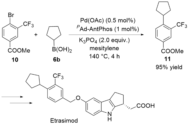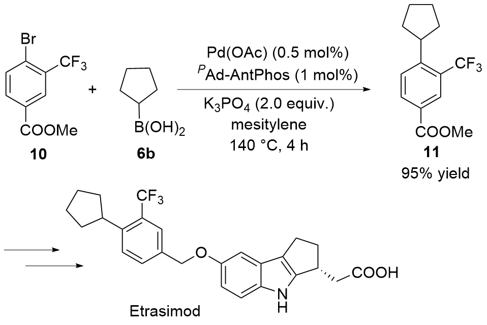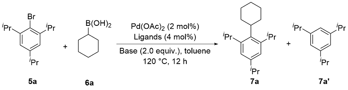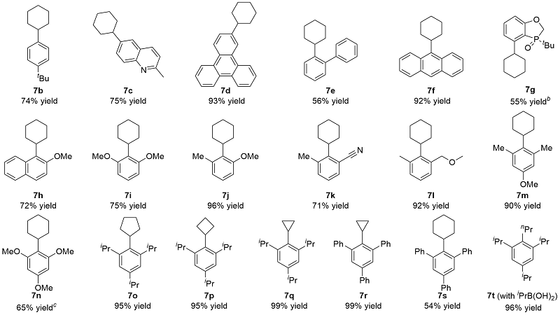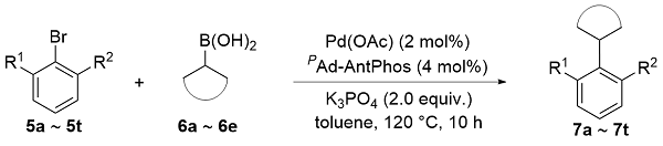 偶联反应操作方法: 取一干净的25 mL史莱克管, 依次加入芳基溴化物5a~5t (0.2 mmol)、环烷基硼酸6a~6e (0.4 mmol, 50.4 mg, 2.0 equiv.)、磷酸钾(85 mg, 0.4 mmol, 2.0 equiv.)、醋酸钯(0.9 mg, 0.004 mmol, 2 mol%)和配体(0.008 mmol, 4 mol%), 抽换氮气三次, 加入甲苯(2 mL), 反应体系在120 ℃下加热反应10 h, 反应结束后柱层析分离得到7a~7t.