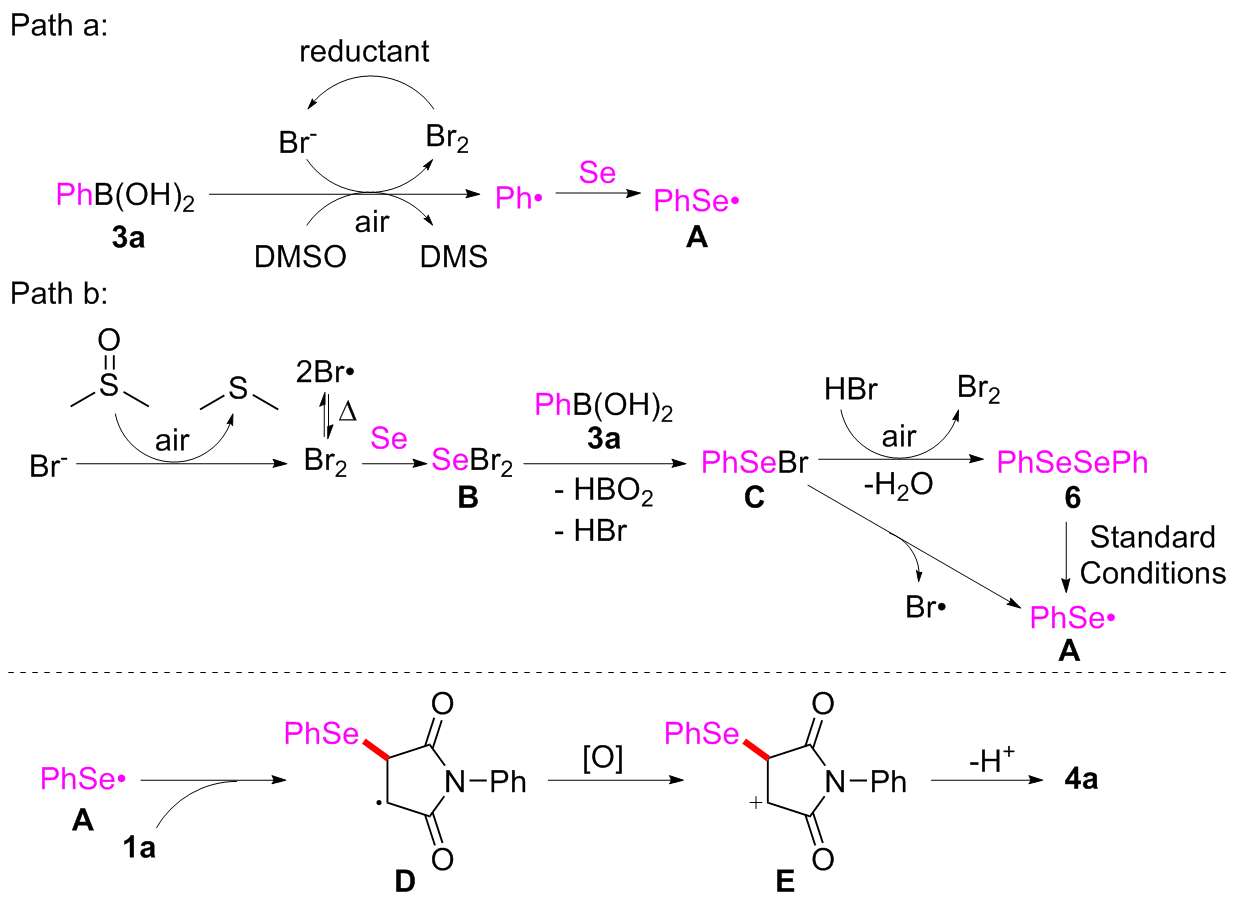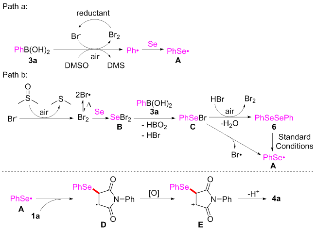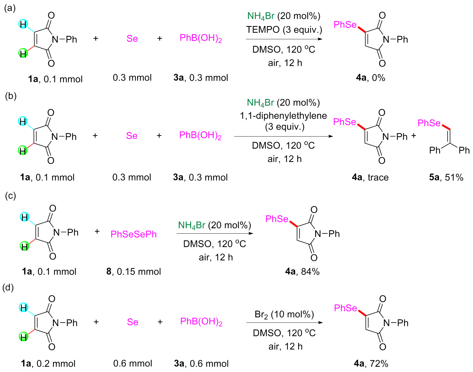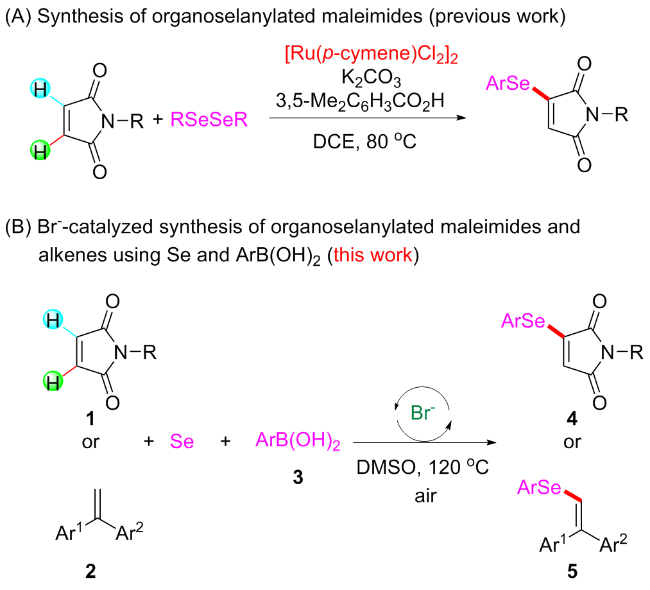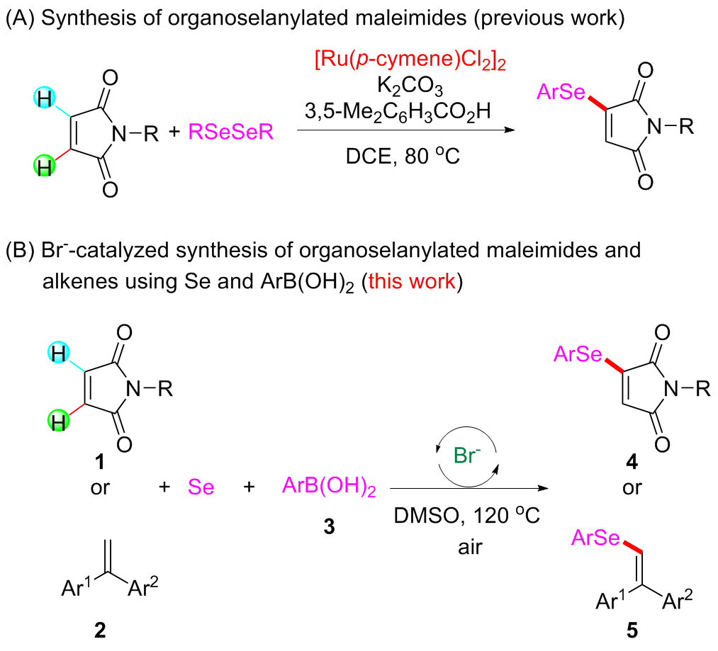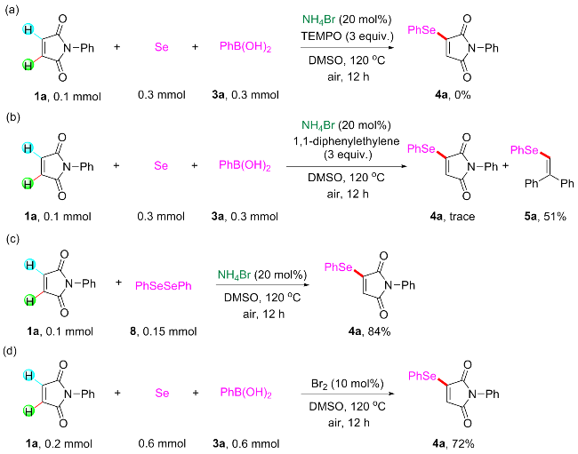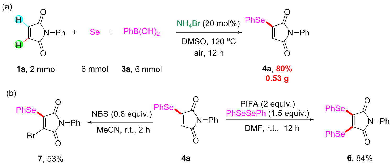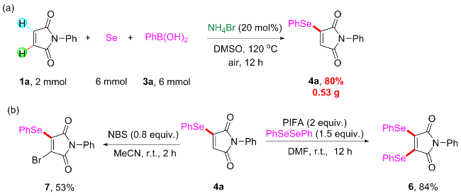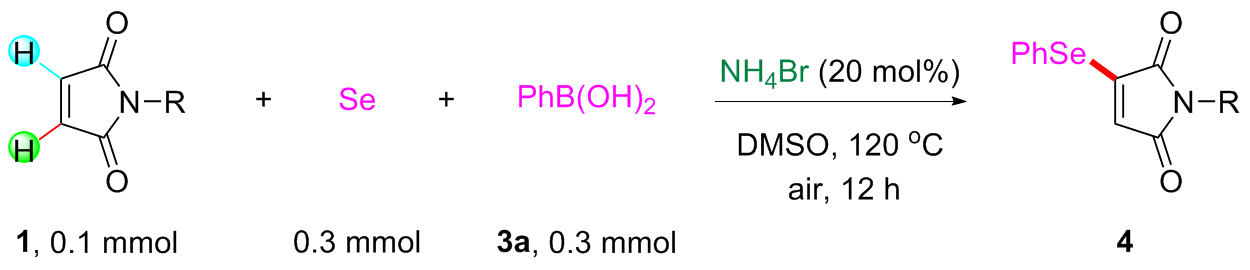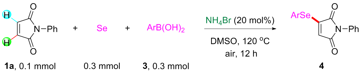 3-(Phenylselanyl)-1H-pyrrole-2,5-dione (4p): Yellow solid, 5.6 mg, 22% yield. m.p. 126~128 ℃; 1H NMR (500 MHz, CDCl3) δ: 7.76 (s, 1H), 7.67~7.61 (m, 2H), 7.51~7.41 (m, 3H), 5.87 (s, 1H); 13C NMR (125 MHz, CDCl3) δ: 169.4, 168.9, 151.7, 136.0, 130.5, 130.3, 125.7, 123.9; HRMS (ESI+) calcd for C10H8NO2Se [M+H]+ 253.9715, found 253.9717.