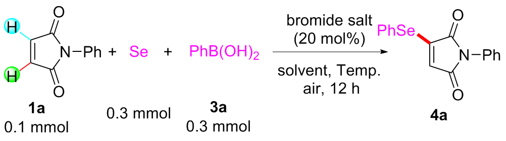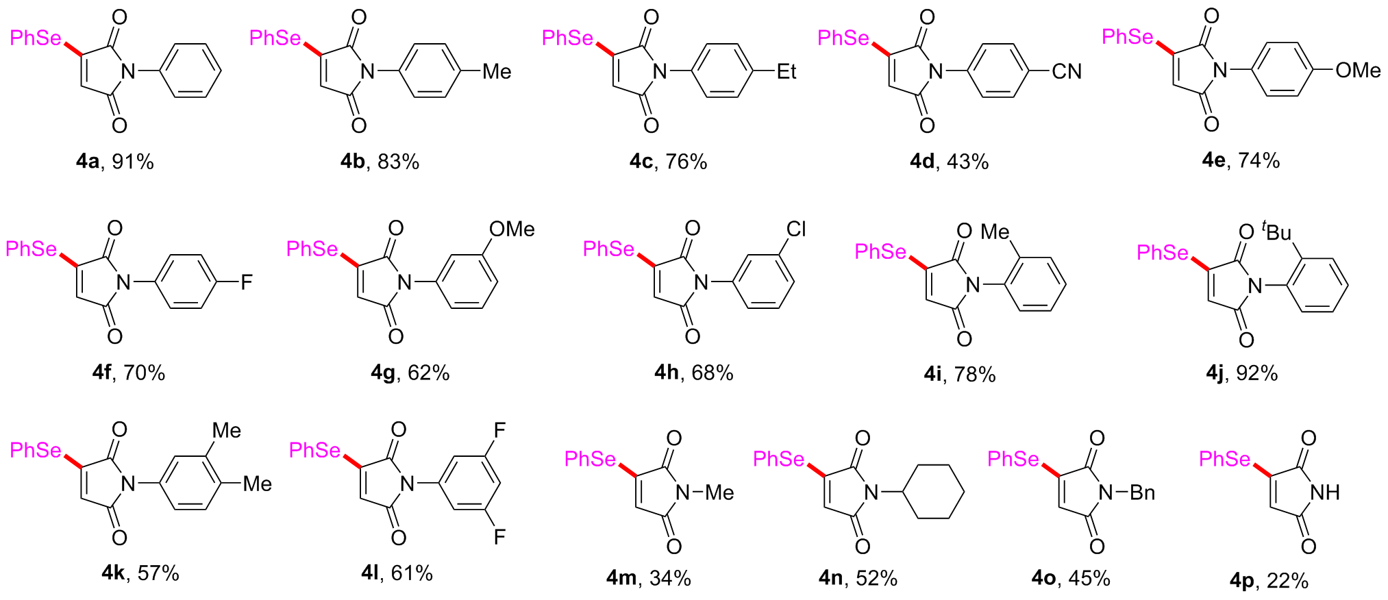 1-Methyl-3-(phenylselanyl)-1H-pyrrole-2,5-dione (4m): Yellow solid, 9.1 mg, 34% yield. m.p. 104~105 ℃; 1H NMR (500 MHz, CDCl3) δ: 7.65~7.60 (m, 2H), 7.51~7.41 (m, 3H), 5.88 (s, 1H), 3.02 (s, 3H); 13C NMR (125 MHz, CDCl3) δ: 169.9, 169.2, 150.6, 136.0, 130.4, 130.2, 124.7, 124.0, 24.2; HRMS (ESI+) calcd for C11H10NO2Se [M+H]+ 267.9871, found 267.9872.