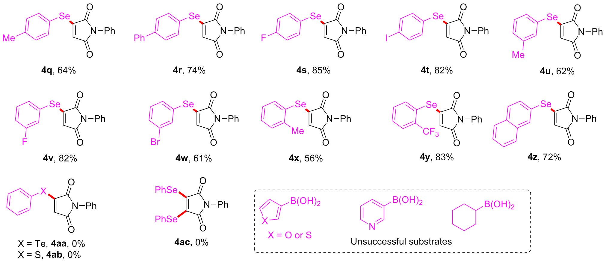 3-((4-Fluorophenyl)selanyl)-1-phenyl-1H-pyrrole-2,5-dione (4s): Yellow solid, 29.4 mg, 85% yield. m.p. 134~135 ℃; 1H NMR (500 MHz, CDCl3) δ: 7.70~7.64 (m, 2H), 7.48~7.43 (m, 2H), 7.38~7.32 (m, 3H), 7.21~7.14 (m, 2H), 6.00 (s, 1H); 13C NMR (125 MHz, CDCl3) δ: 168.3, 167.7, 164.1 (d, J=250.0 Hz), 151.0, 138.3 (d, J=8.6 Hz), 131.5, 129.3, 128.0, 126.0, 124.8, 118.5 (d, J=3.6 Hz), 118.0 (d, J=21.3 Hz); 19F NMR (471 MHz, CDCl3) δ: 109.27; HRMS (ESI+) calcd for C16H11FNO2Se [M+ H]+ 347.9934, found 347.9934.